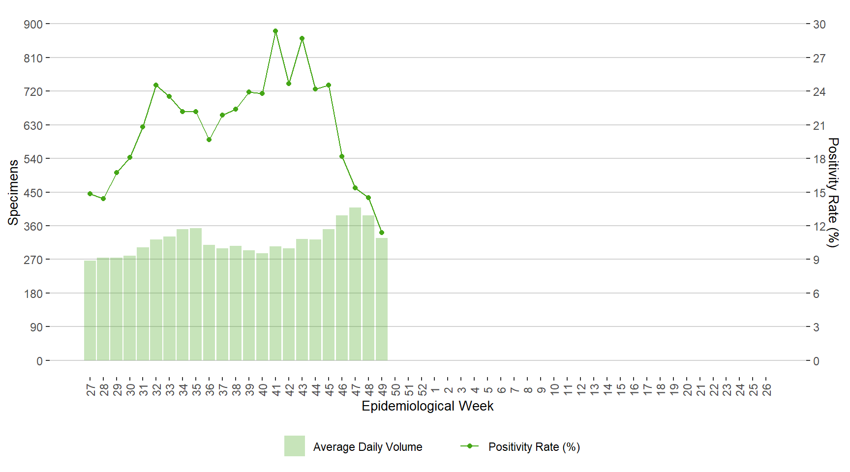 Figure 5. Average Daily Testing Volume and Positivity (%) for COVID-19 by Week of Specimen Receiving Date, Manitoba, July 3, 2022 – December 10, 2022