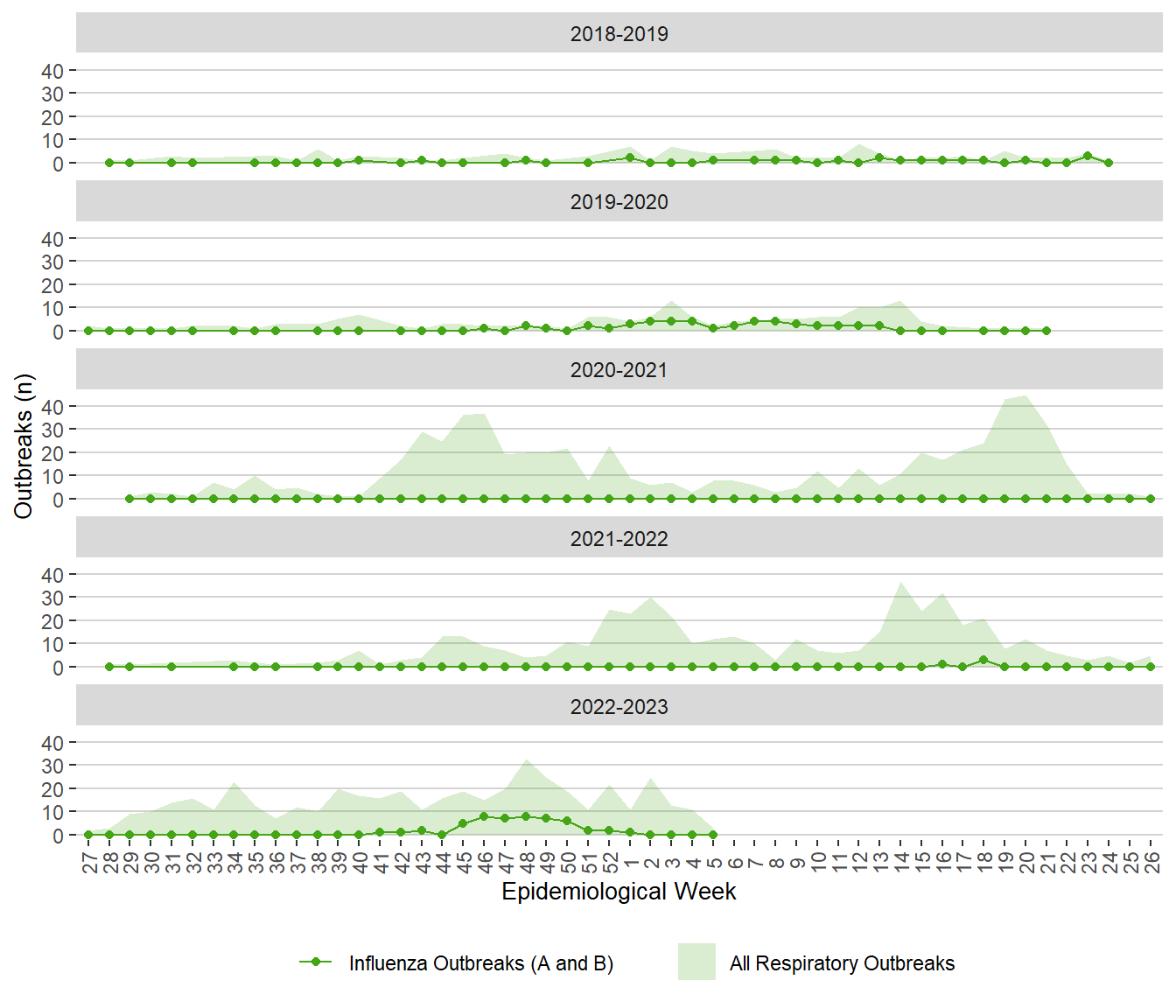 Note: All respiratory outbreaks include COVID-19 outbreaks, influenza outbreaks and the other respiratory outbreaks with known or unknown pathogens.