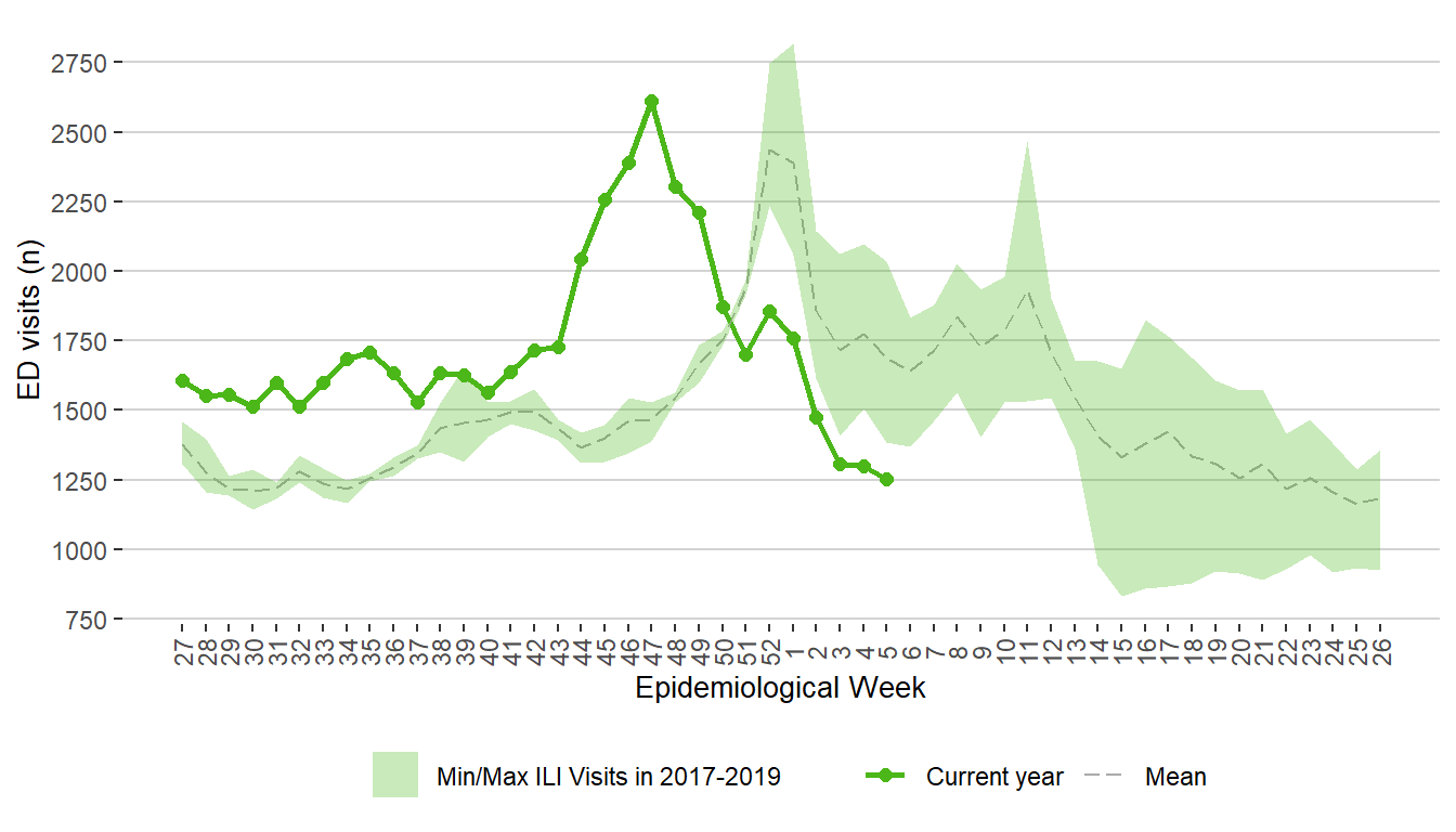 Figure 19. Weekly Respiratory Visits to Emergency Department, Manitoba, 2017 – February 4, 2022