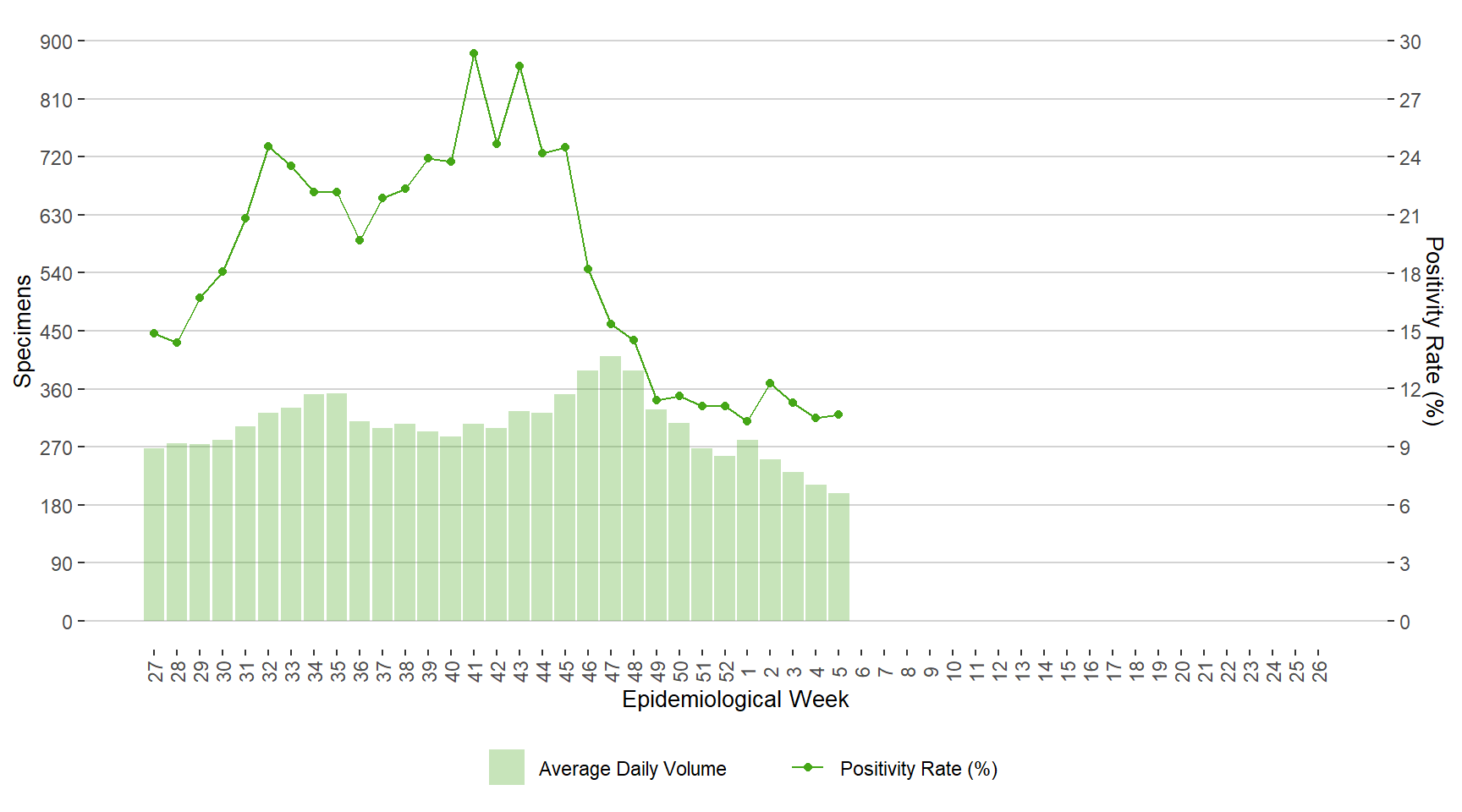 BackFigure 11. Average Daily Testing Volume and Positivity (%) for Influenza by Week of Specimen Receiving Date, Manitoba, July 3, 2022 – February 4, 2022