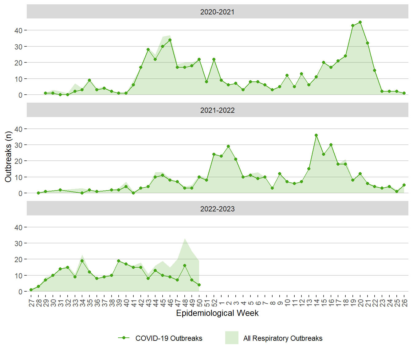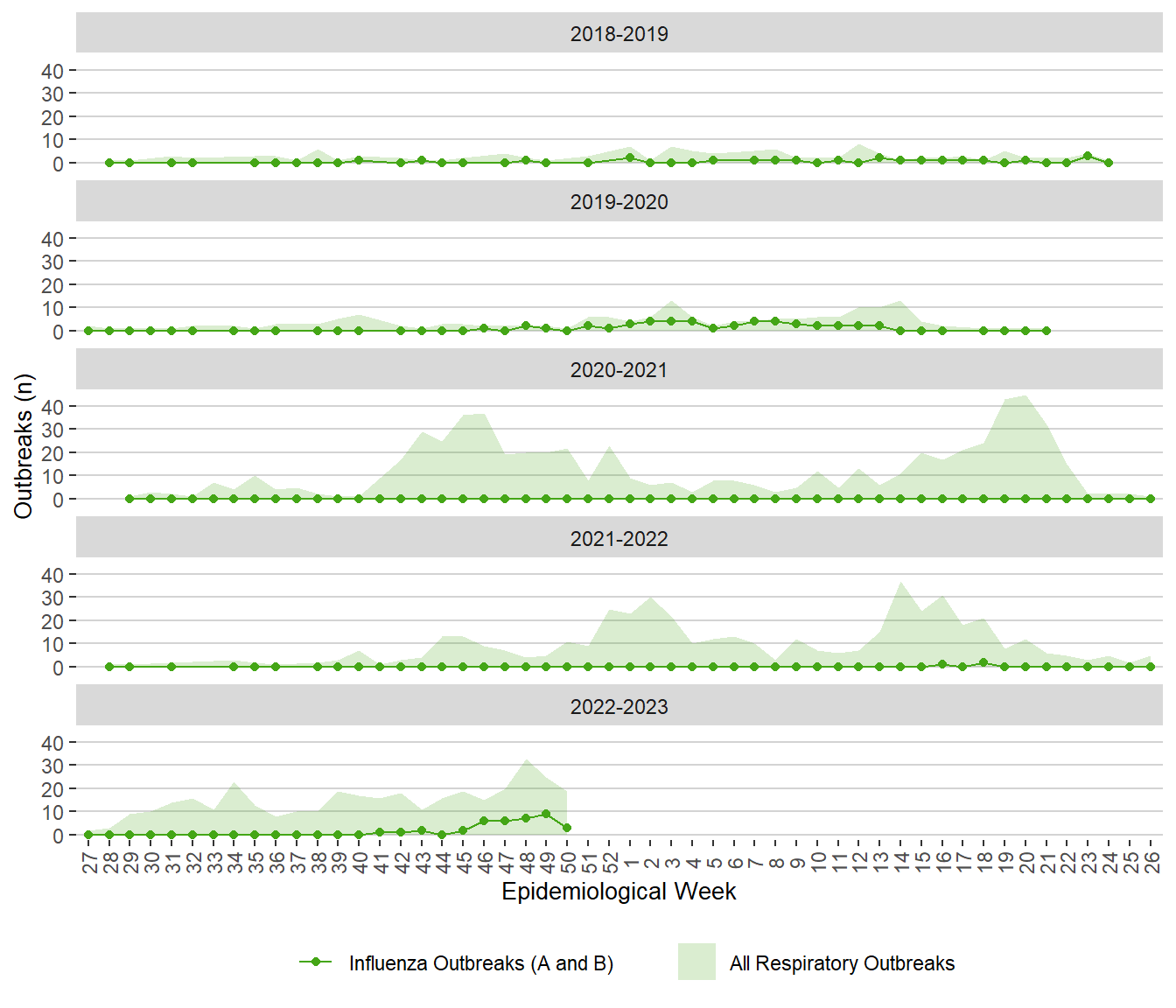 Note: All respiratory outbreaks include COVID-19 outbreaks, influenza outbreaks and the other respiratory outbreaks with known or unknown pathogens.
