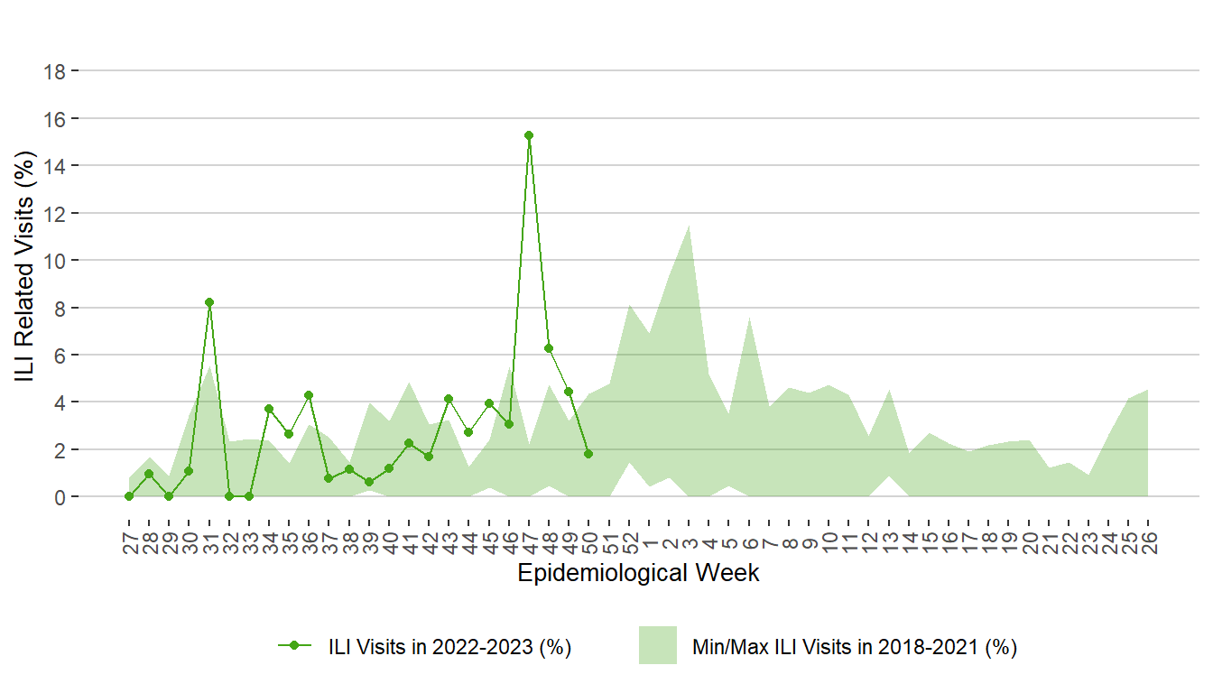 Figure 17. Weekly Percentage of ILI Related Visits to Sentinel Physicians, Manitoba, 2018 – December 17, 2022
