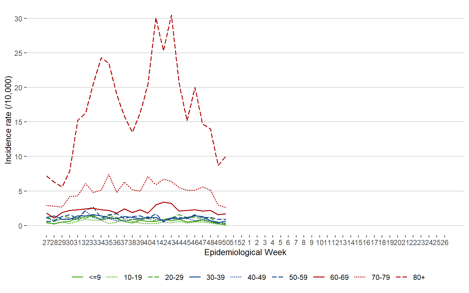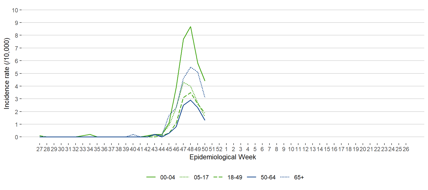 Figure 10. Incidence Rate (/10,000 Population) of Influenza Cases by Age Group and Week of Public Health Report Date, 2018 – December 17, 2022