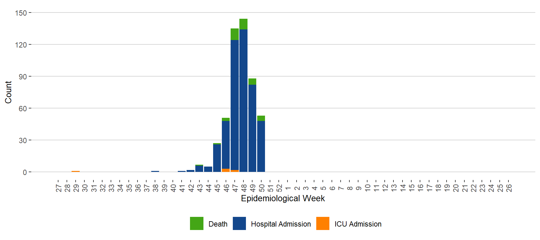 BackFigure 13. Severe Outcomes of Influenza by Week of Outcome Date, Manitoba, July 3, 2022 – December 17, 2022