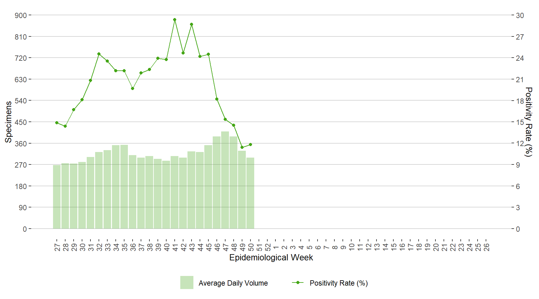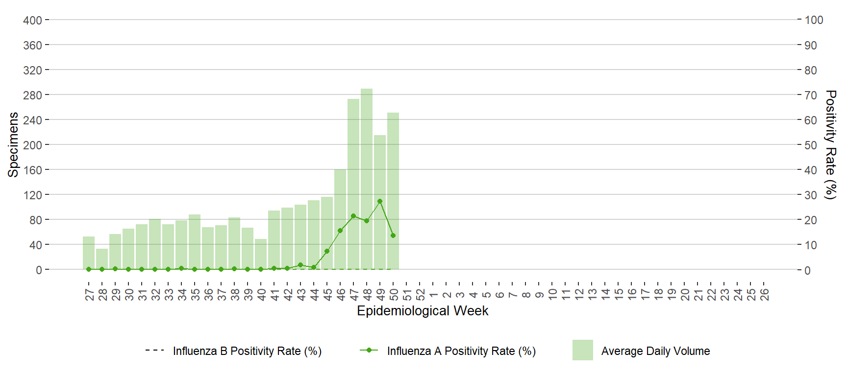 BackFigure 11. Average Daily Testing Volume and Positivity (%) for Influenza by Week of Specimen Receiving Date, Manitoba, July 3, 2022 – December 17, 2022