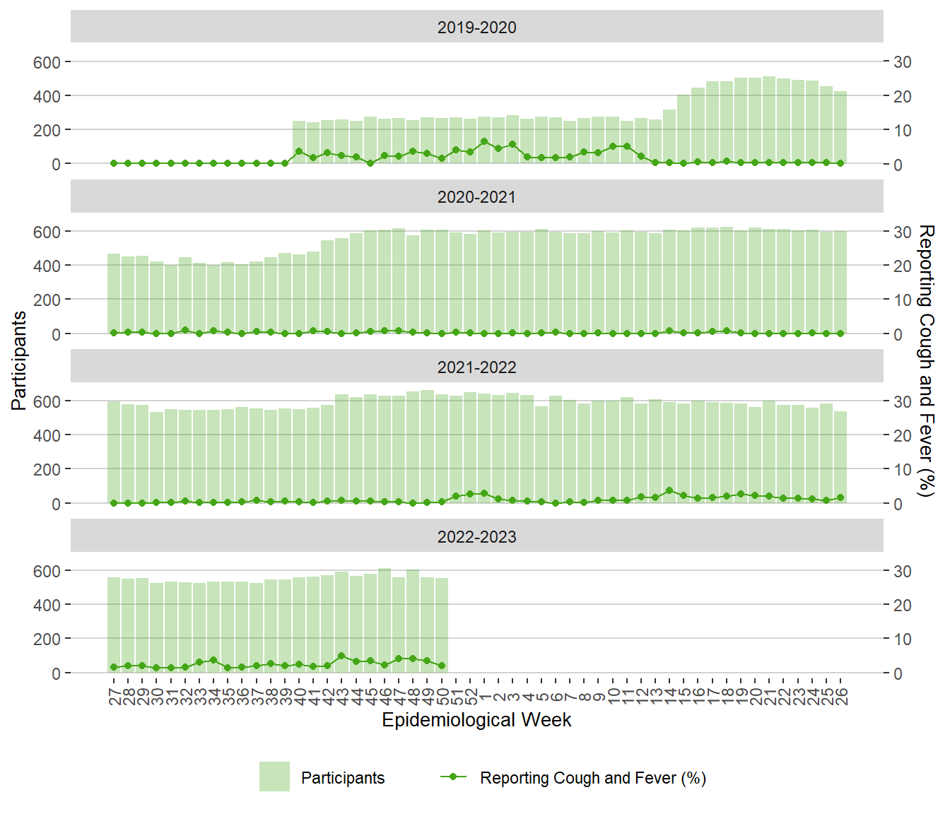 Figure 16. Weekly FluWatchers Participants and Percentage Reporting Fever and Cough, Manitoba, 2019 – December 17, 2022