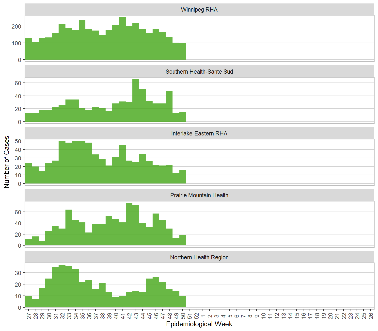 | Helath region | Total cases | Cases this week | Incidence rate this week | Age-standardized incidence rate* this week |