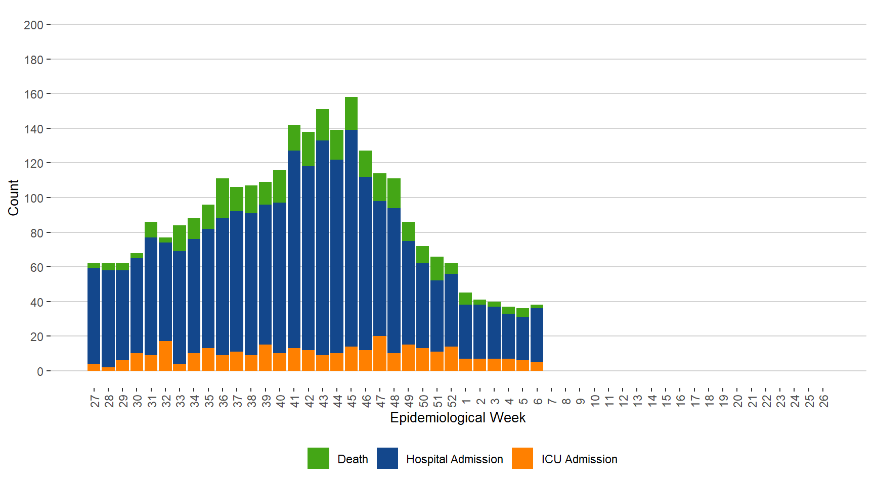 BackFigure 13. Severe Outcomes of Influenza by Week of Outcome Date, Manitoba, July 3, 2022 – February 11, 2022
