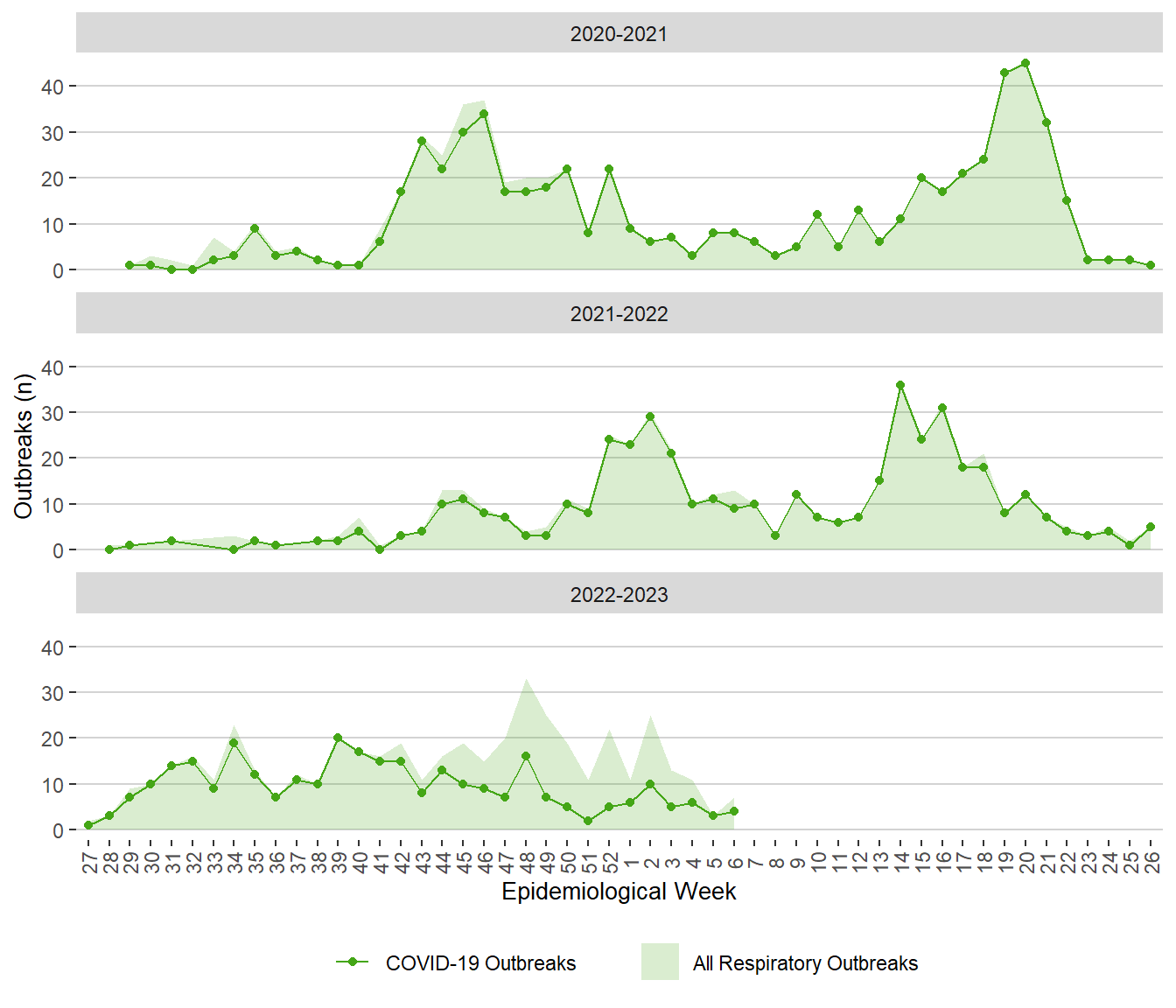 Note: All respiratory outbreaks include COVID-19 outbreaks, influenza outbreaks and the other respiratory outbreaks with known or unknown pathogens.