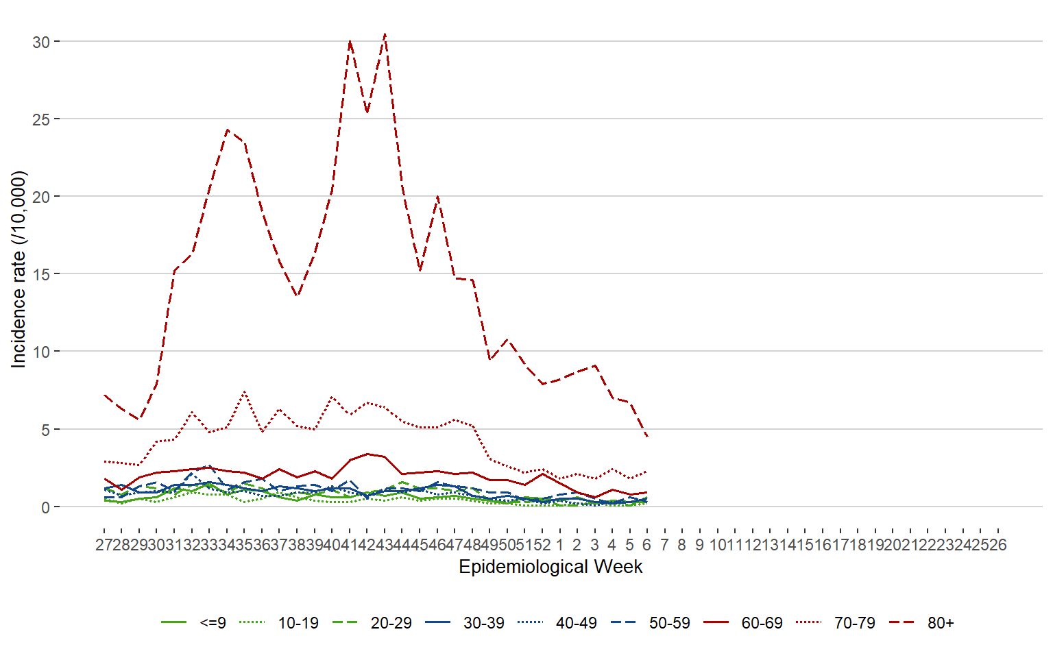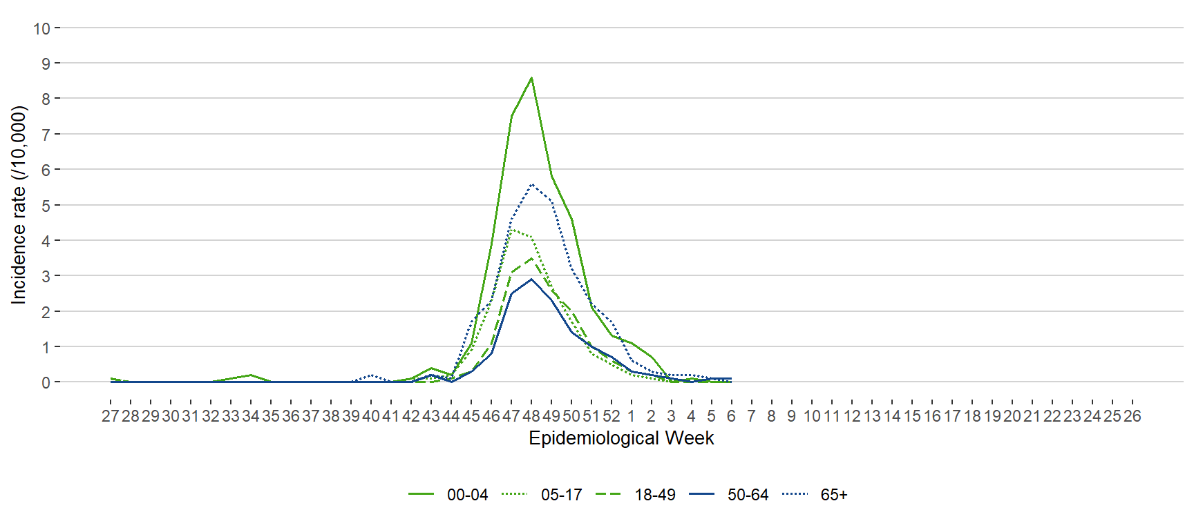 Figure 10. Incidence Rate (/10,000 Population) of Influenza Cases by Age Group and Week of Public Health Report Date, 2018 – February 11, 2022