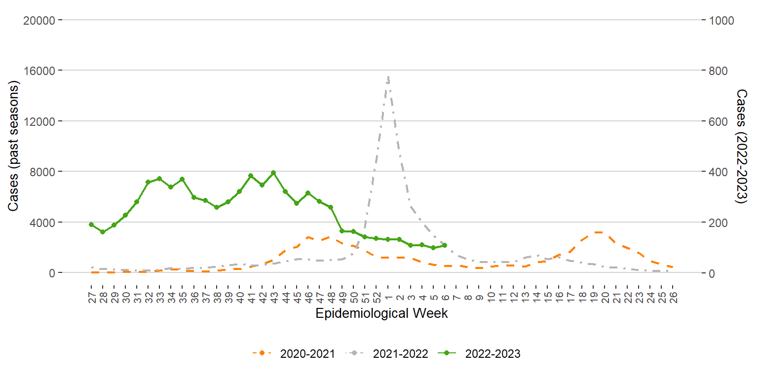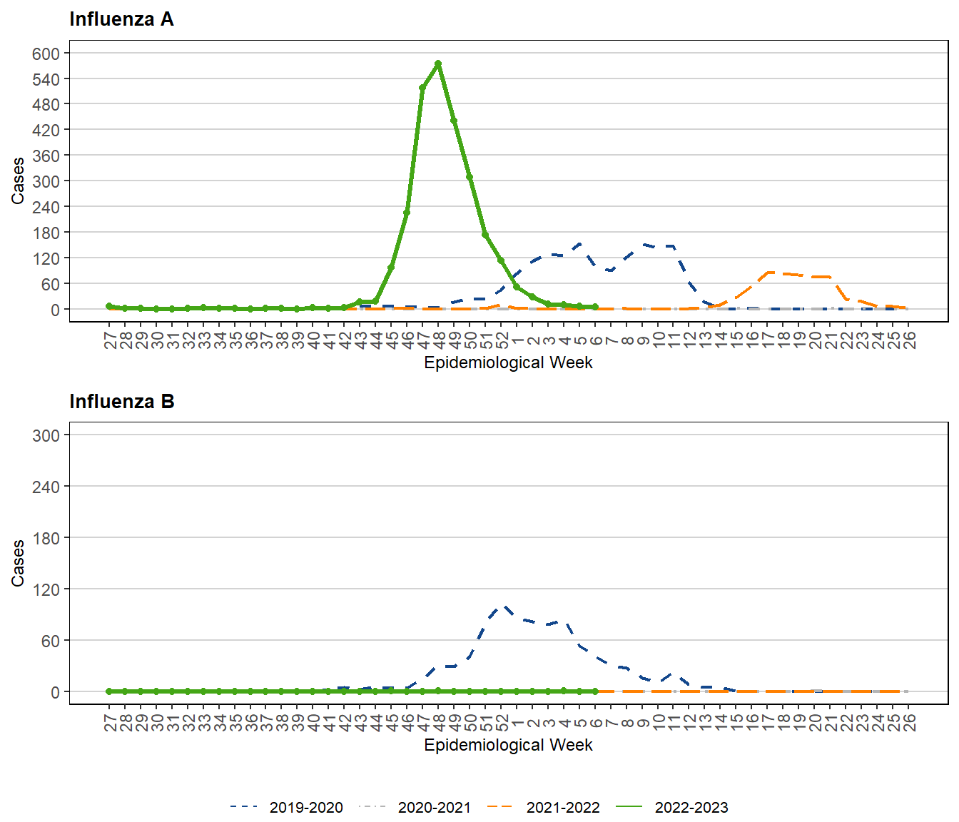 Notes: A/Darwin/6/2021-like virus is the H3N2 virus selected for the 2022/23 Northern Hemisphere Influenza vaccine. A/Wisconsin/588/2019-like virus is the recommmended H1N1 component for the 2022-2023 Northern Hemisphere influenza vaccine.
