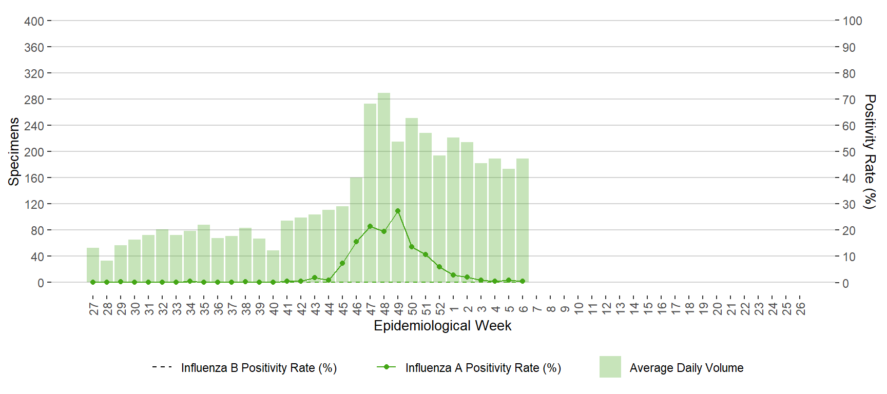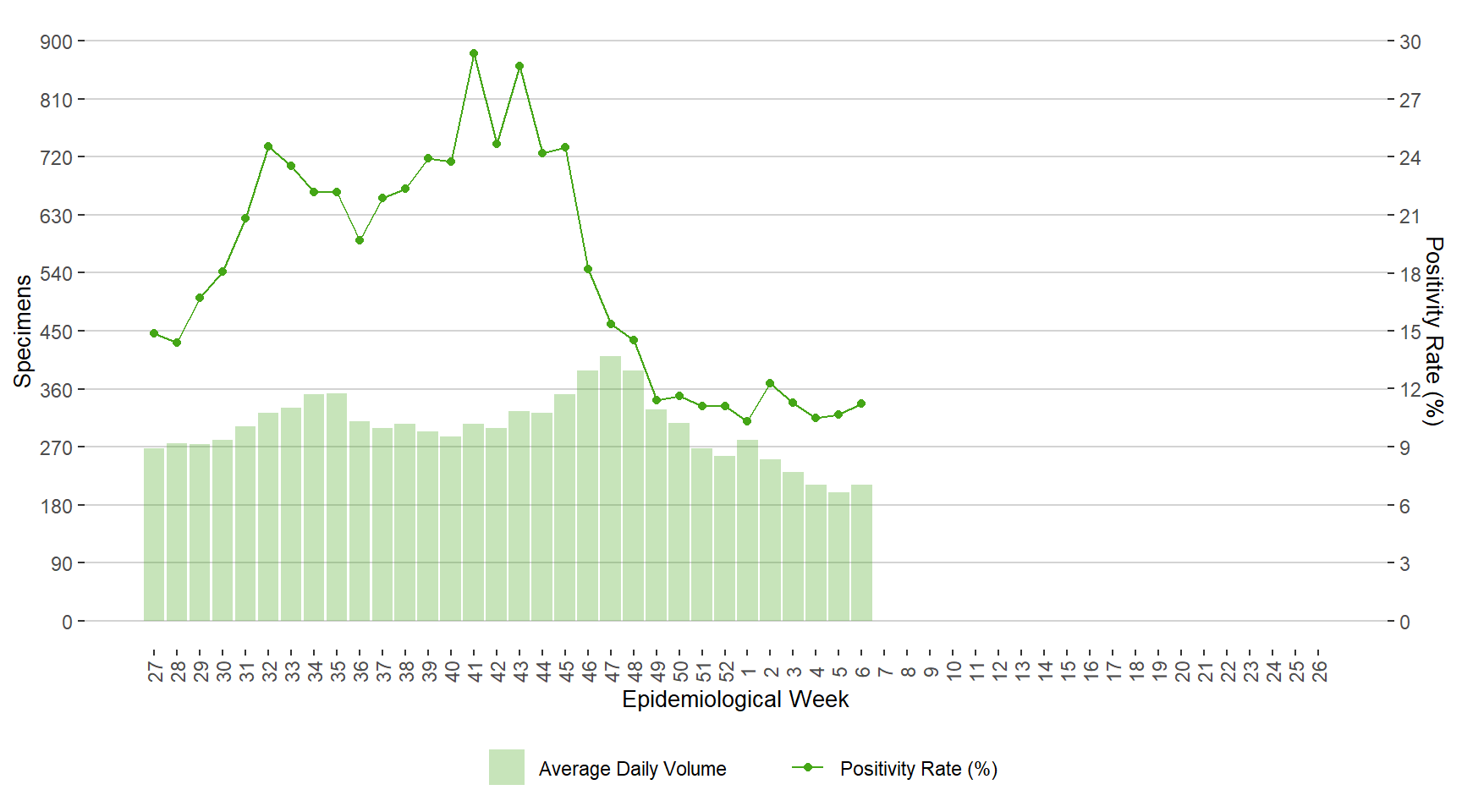 BackFigure 11. Average Daily Testing Volume and Positivity (%) for Influenza by Week of Specimen Receiving Date, Manitoba, July 3, 2022 – February 11, 2022