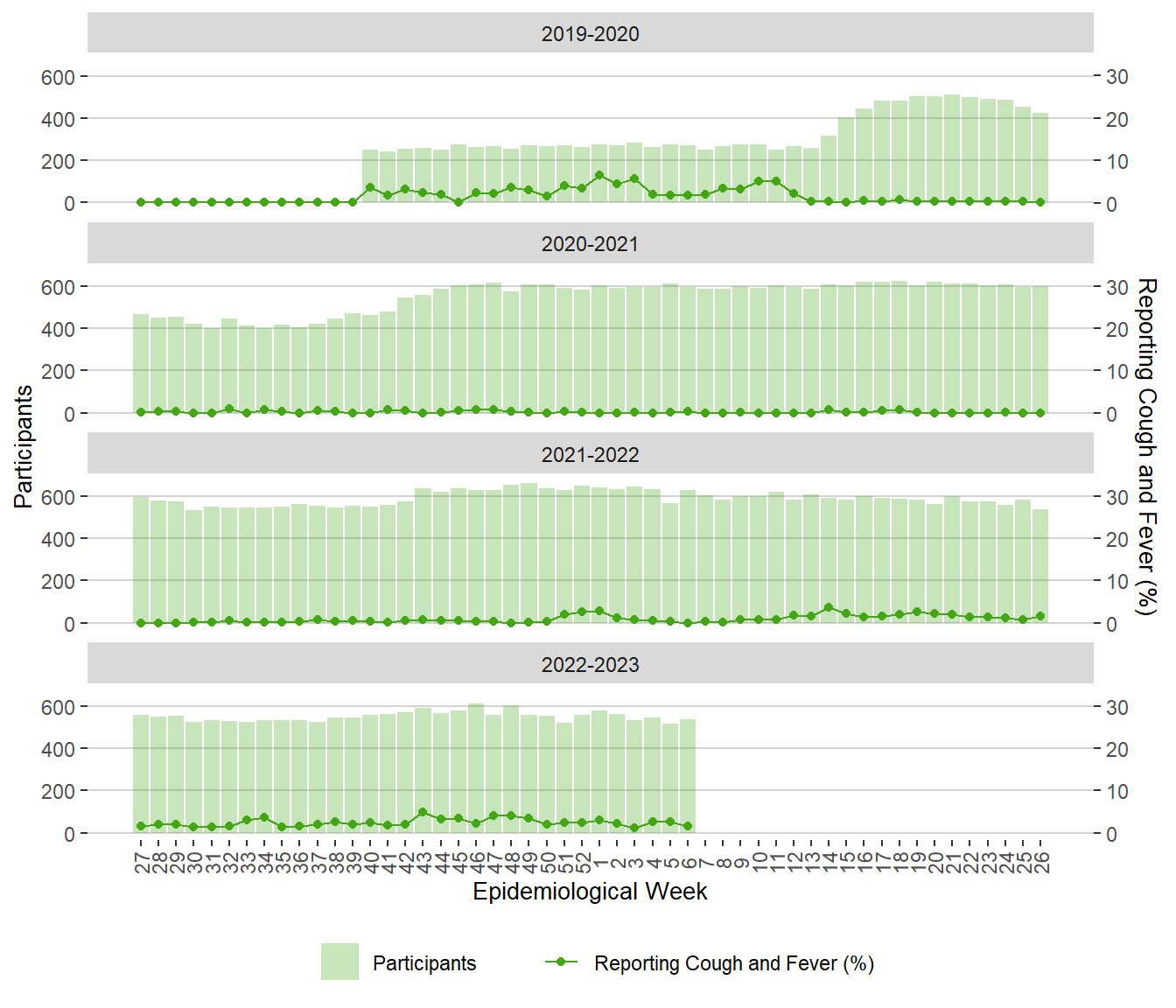 Figure 16. Weekly FluWatchers Participants and Percentage Reporting Fever and Cough, Manitoba, 2019 – February 11, 2022