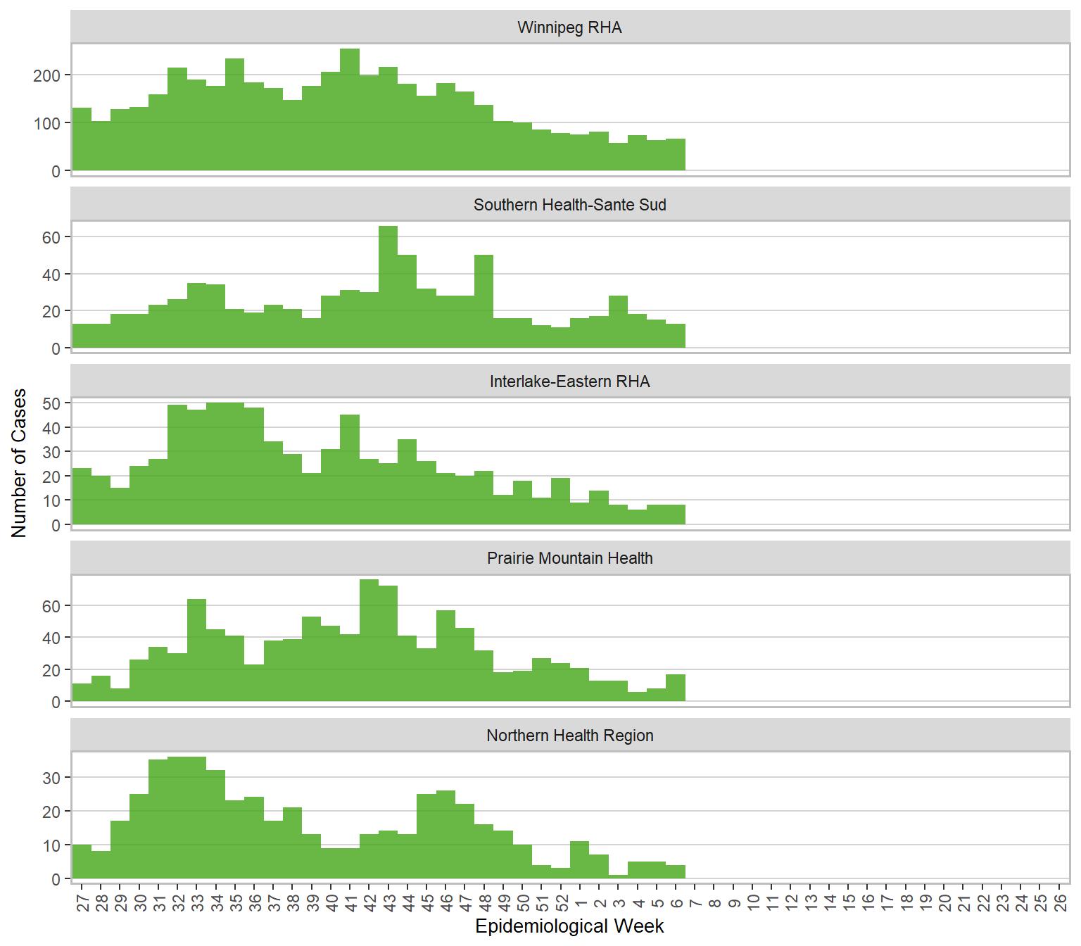 This weekly report provides a current epidemiological update on the intensity and severity of respiratory activity in Manitoba including laboratory confirmed activity of both COVID-19 and seasonal influenza. Surveillance data include syndromic indicators, laboratory testing, associated hospitalization and mortality, and outbreaks. Updates around immunization coverage in COVID-19 and seasonal influenza are also included.