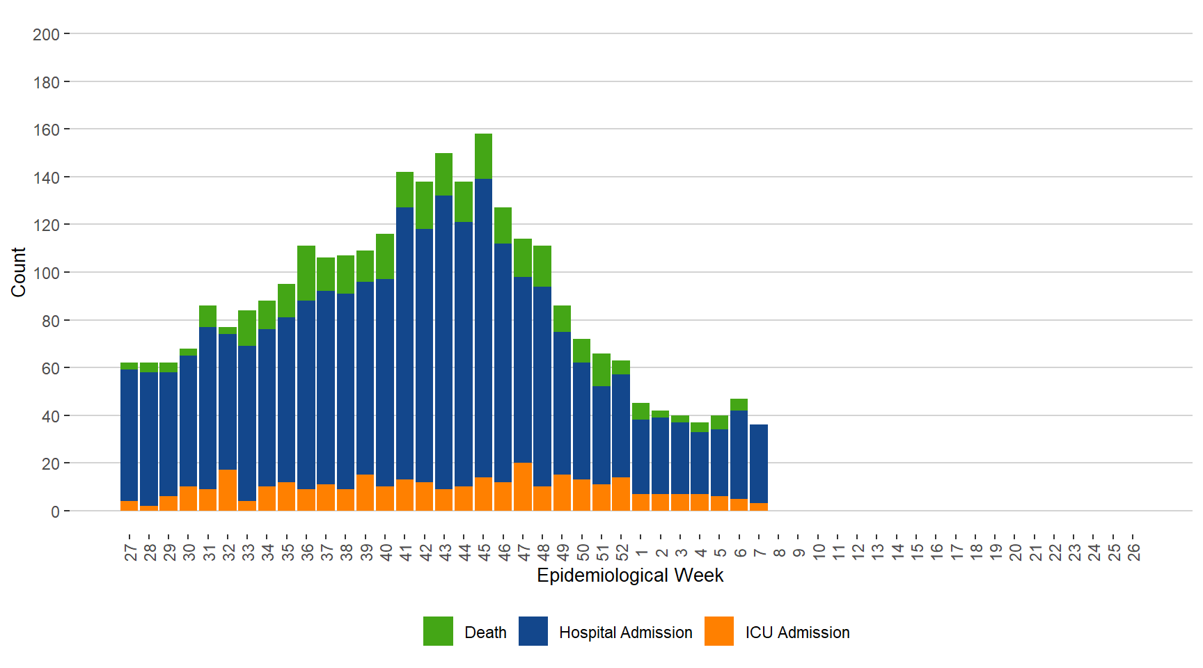BackFigure 13. Severe Outcomes of Influenza by Week of Outcome Date, Manitoba, July 3, 2022 – February 18, 2022