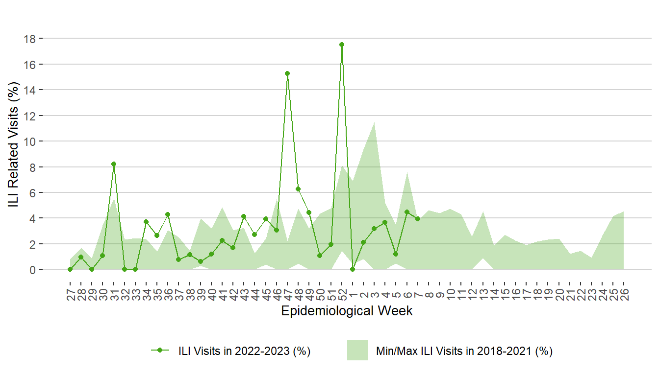 Figure 17. Weekly Percentage of ILI Related Visits to Sentinel Physicians, Manitoba, 2018 – February 18, 2022