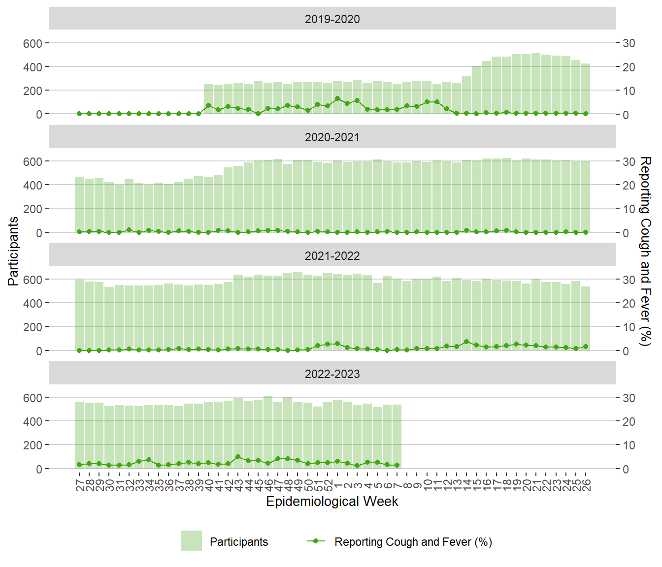 Figure 16. Weekly FluWatchers Participants and Percentage Reporting Fever and Cough, Manitoba, 2019 – February 18, 2022