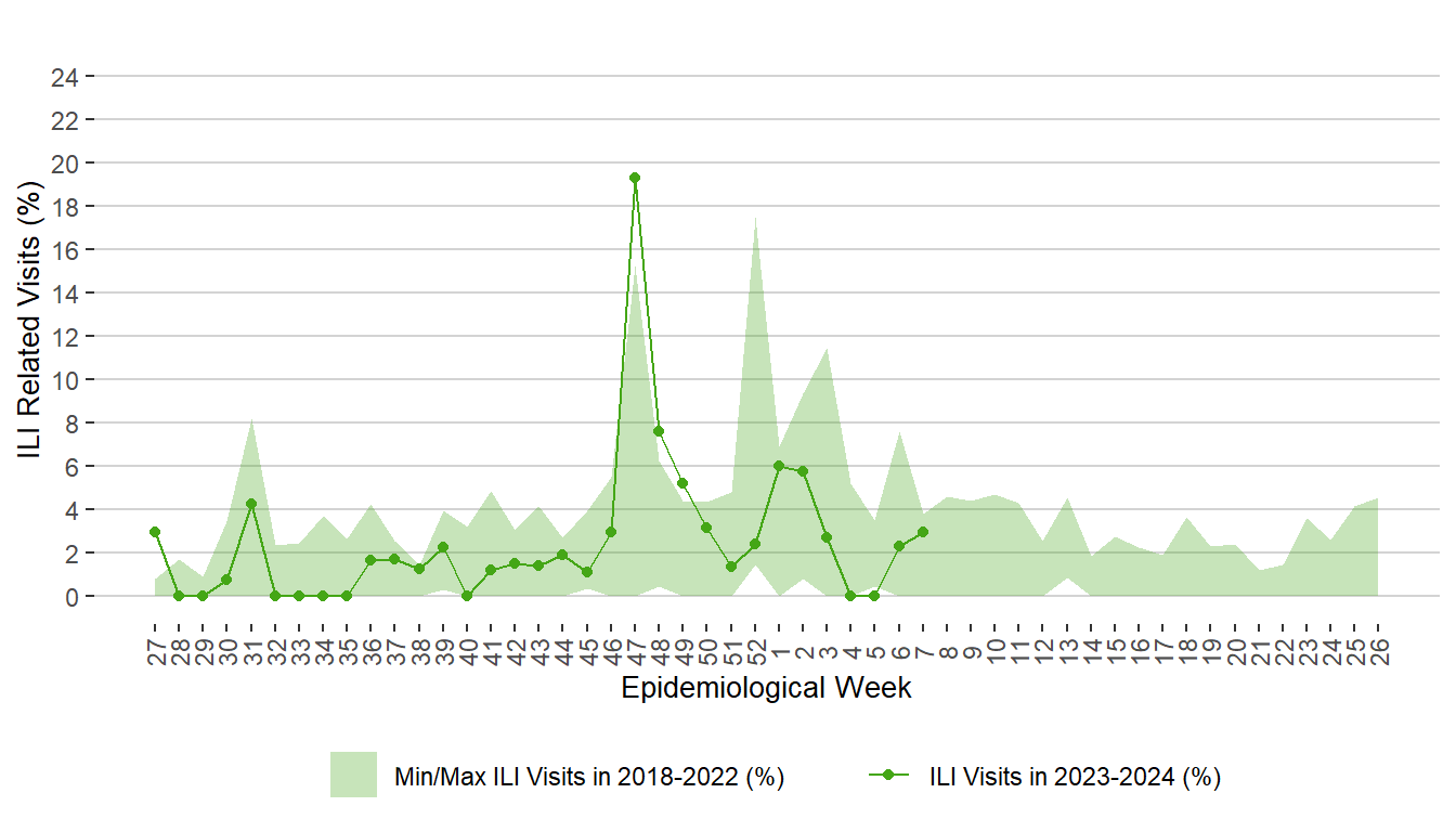 Figure 10. Weekly Percentage of ILI Related Visits to Sentinel Physicians, Manitoba, 2018 – February 17, 2024