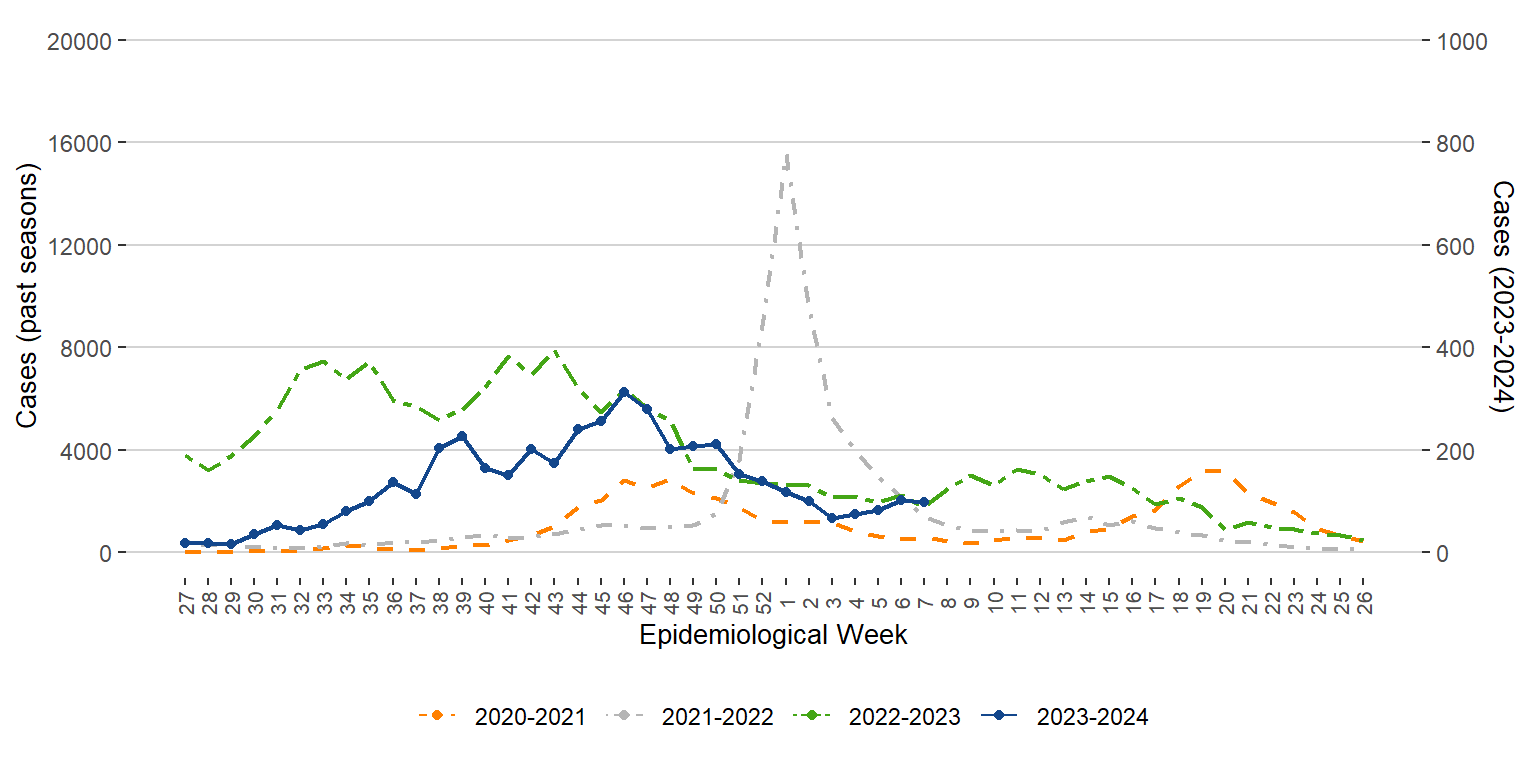 Figure 7. Number of Positive Respiratory Virus Tests by Week of Specimen Receiving Date, Manitoba, July 2, 2023 – February 17, 2024