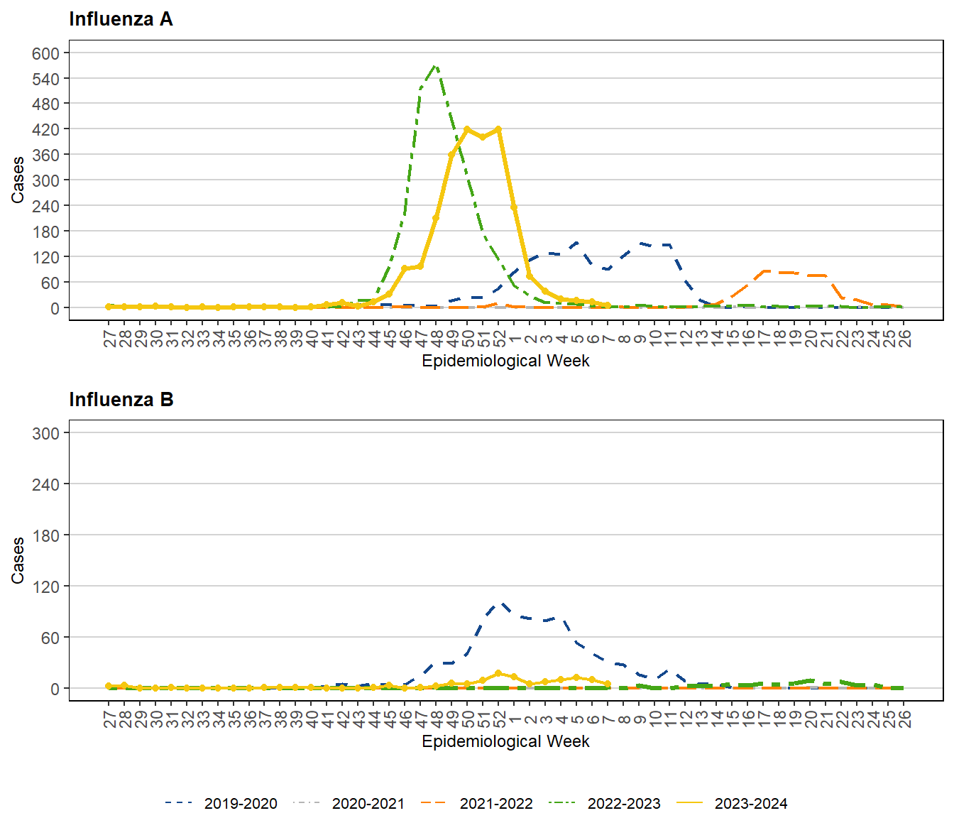 Figure 5. Weekly Cases of Influenza by Season, Manitoba, 2019 – 2024 (July through June)