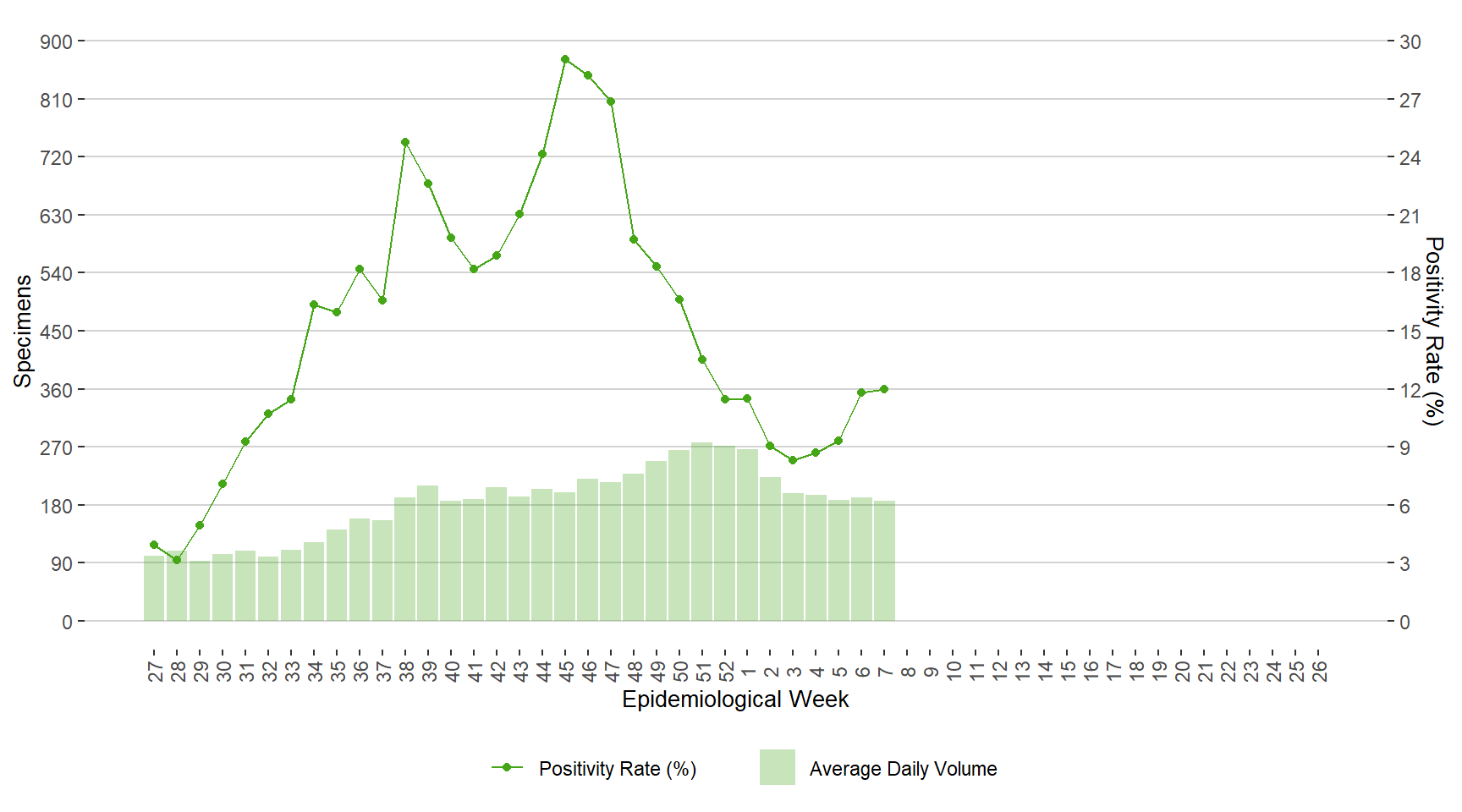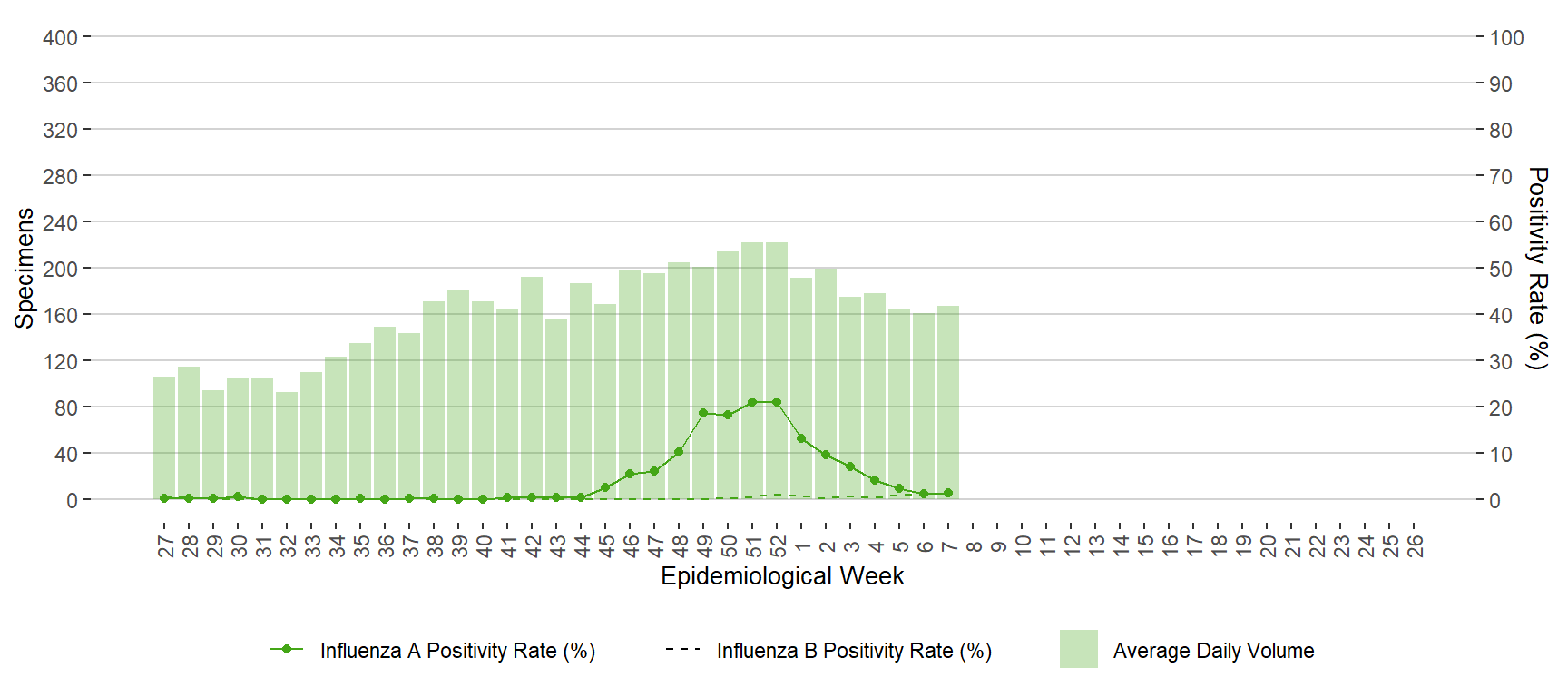 Figure 6. Average Daily Testing Volume and Positivity (%) for Influenza by Week of Specimen Receiving Date, Manitoba, July 2, 2023 – February 17, 2024