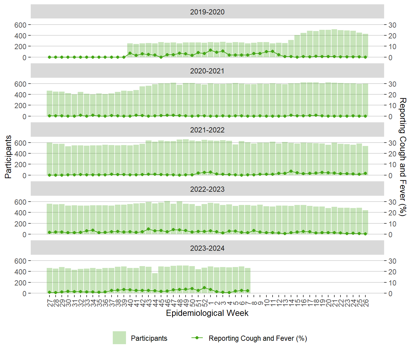 Figure 9. Weekly FluWatchers Participants and Percentage Reporting Fever and Cough, Manitoba, 2019 – February 17, 2024