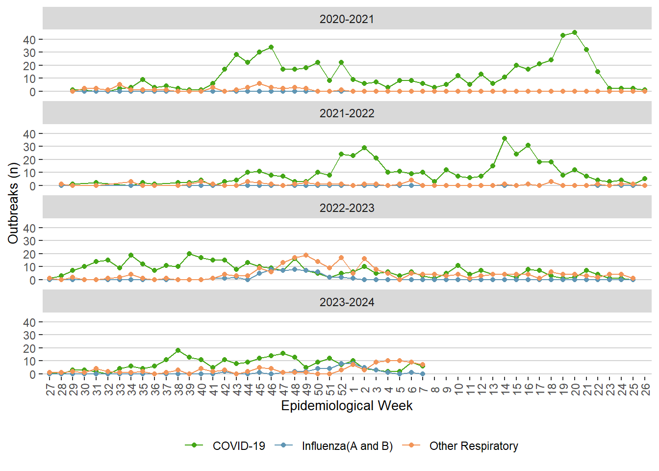 BackFigure 8. Weekly Respiratory Outbreaks, Manitoba, July 12, 2020 – February 17, 2024