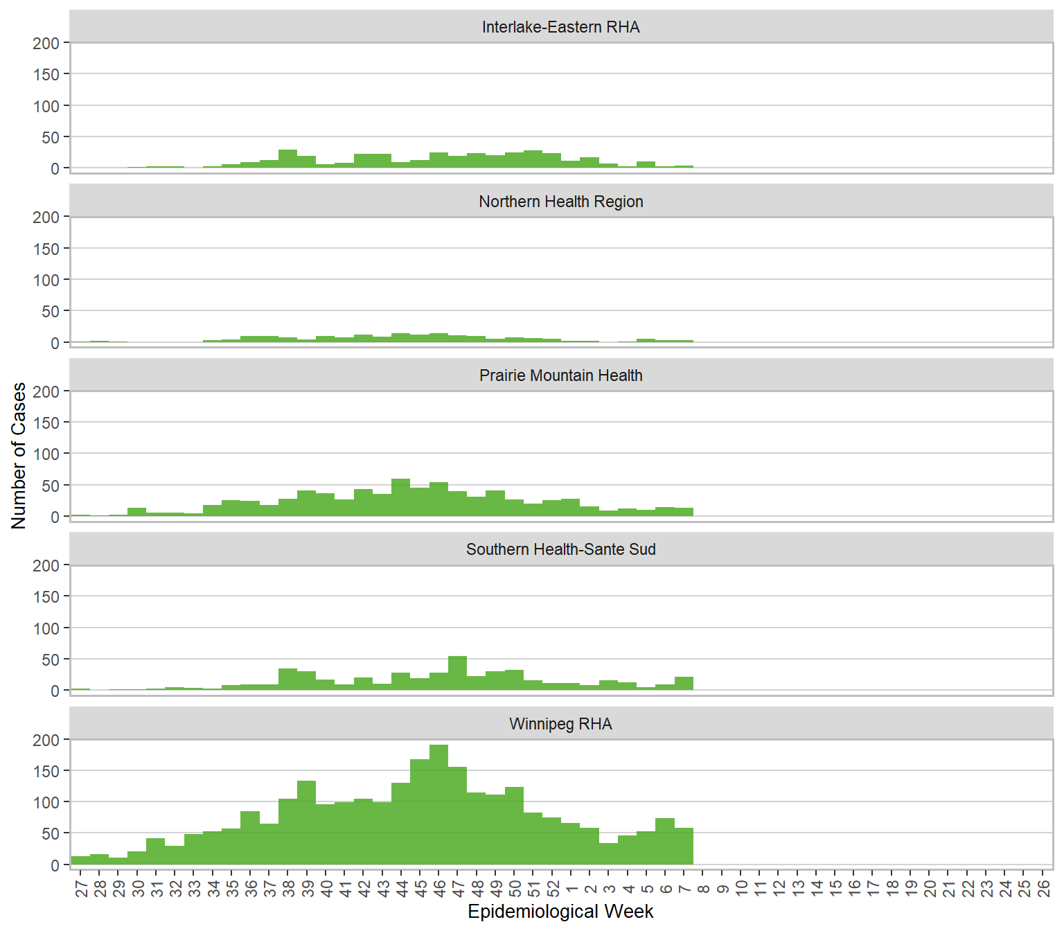Figure 3. Cases of COVID-19 by Health Region and Public Health Report Date, Manitoba, July 2, 2023 – February 17, 2024