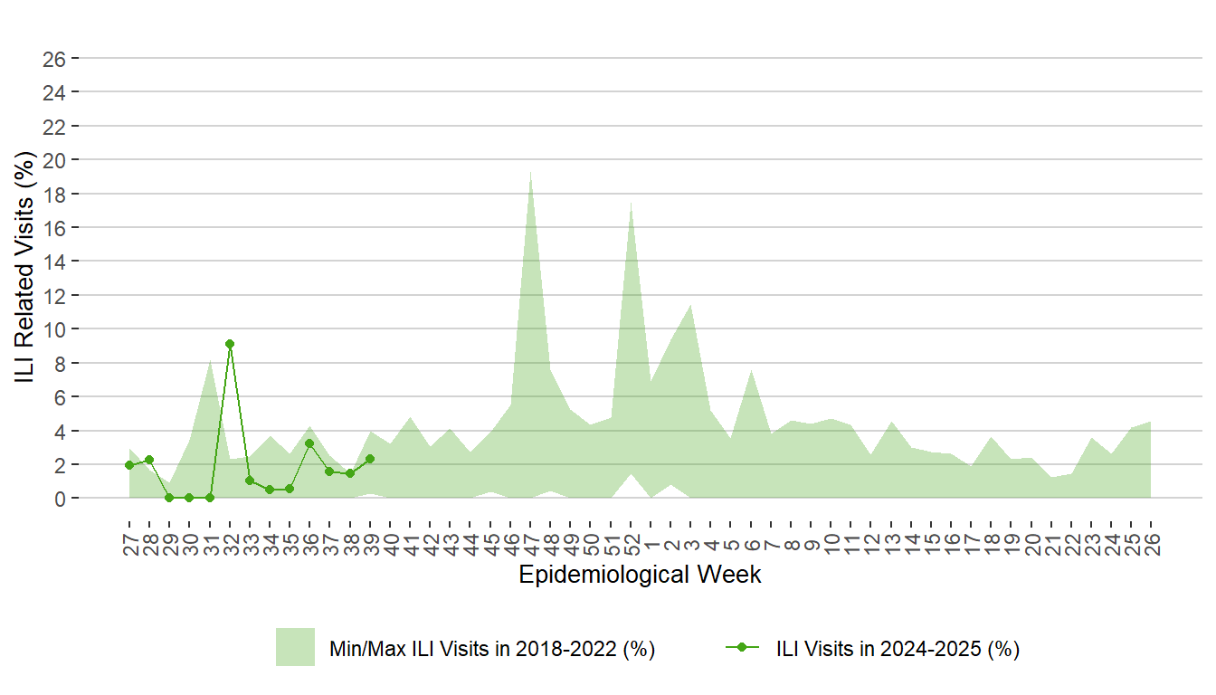 Figure 10. Weekly Percentage of ILI Related Visits to Sentinel Physicians, Manitoba, 2018 – September 28, 2024