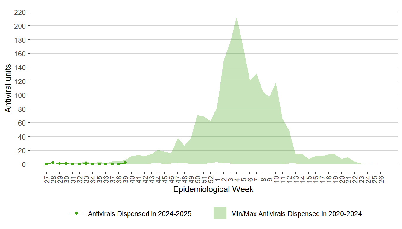 Figure 11. Weekly Units of Antiviral Dispensed from Pharmacies, Manitoba, 2020 – September 28, 2024