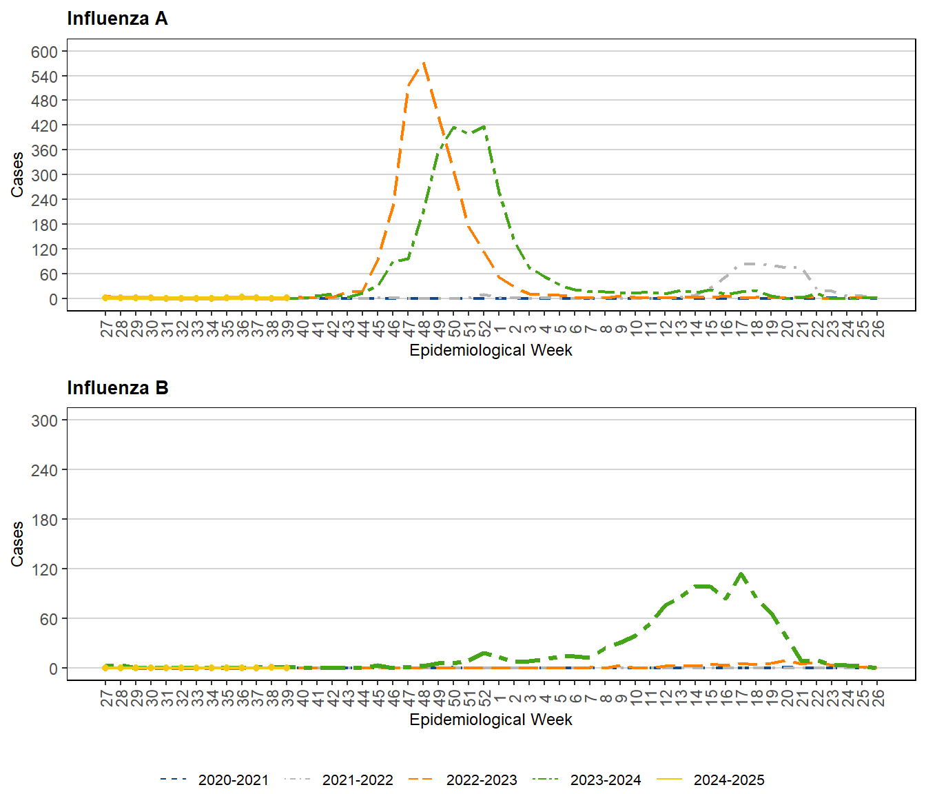 Figure 5. Weekly Cases of Influenza by Season, Manitoba, 2020 – 2025 (June through June)