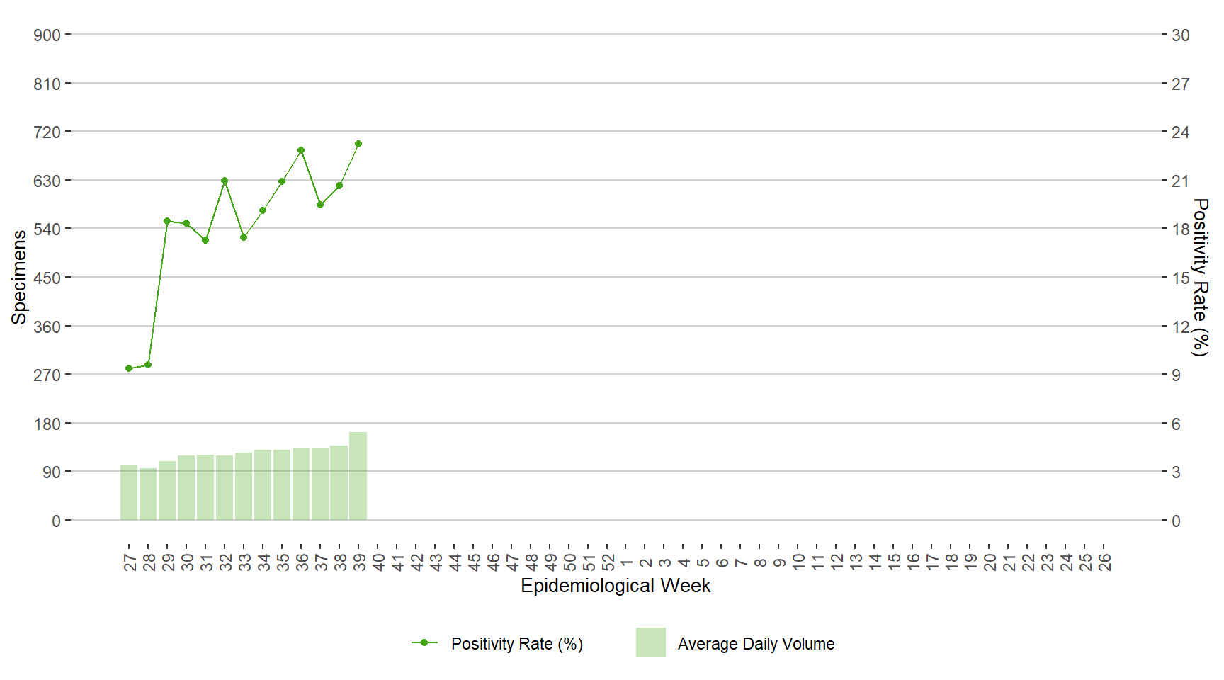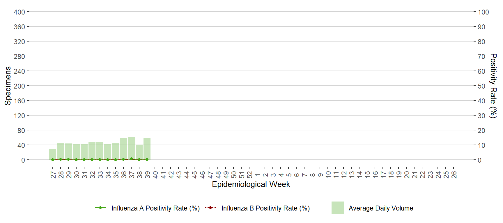Figure 6. Average Daily Testing Volume and Positivity (%) for Influenza by Week of Specimen Receiving Date, Manitoba, June 30, 2024 – September 28, 2024