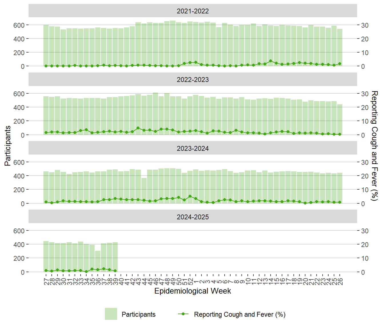 Figure 9. Weekly FluWatchers Participants and Percentage Reporting Fever and Cough, Manitoba, 2020 – September 28, 2024