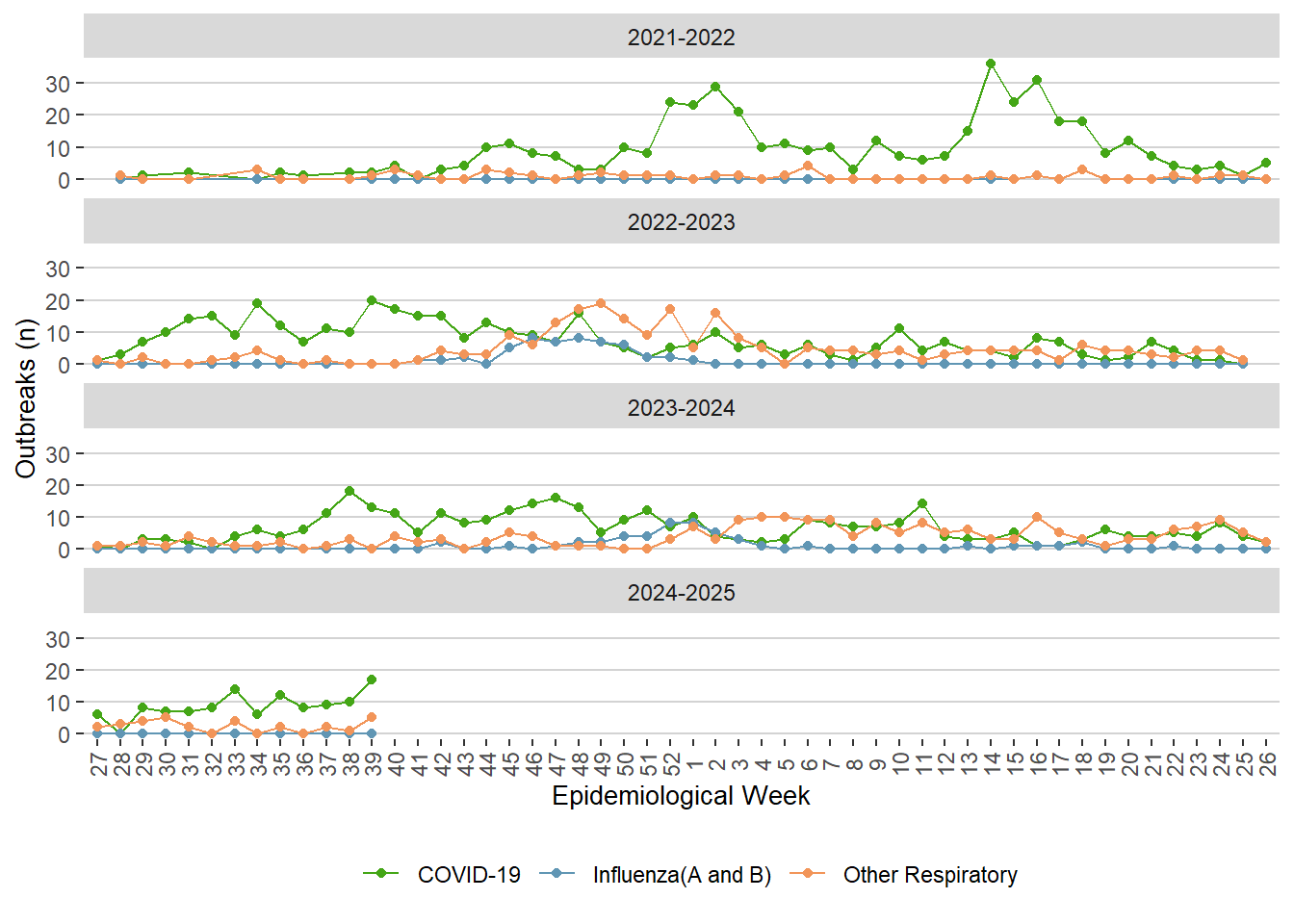 BackFigure 8. Weekly Respiratory Outbreaks, Manitoba, 2021 – September 28, 2024
