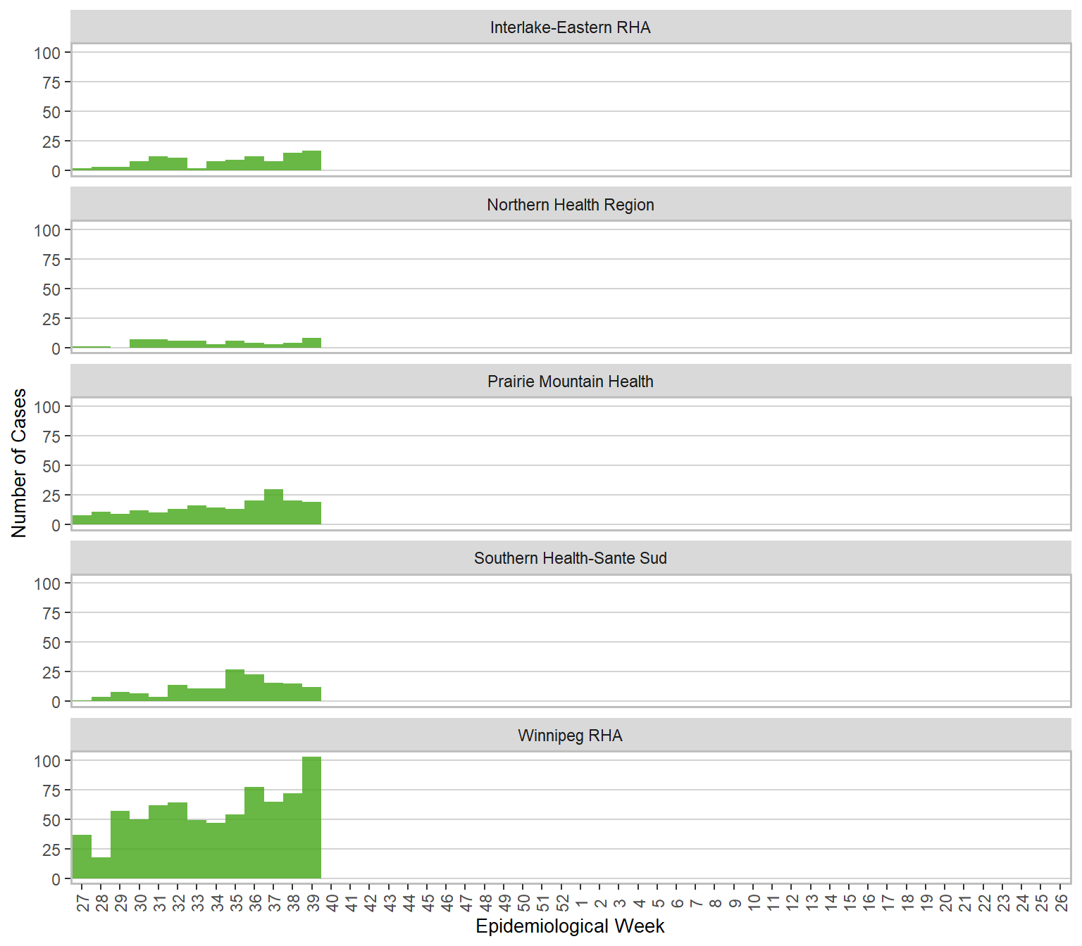 Figure 3. Cases of COVID-19 by Health Region and Public Health Report Date, Manitoba, June 30, 2024 – September 28, 2024