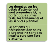 Les services de lutte contre le cancer peuvent inclure la consultation d’un oncologue, la radiothérapie, la chimiothérapie et la chirurgie. Le temps que vous attendrez pour de tels services dépend de votre plan de traitement, de la partie du corps où le cancer se trouve et du stade d’évolution de celui-ci. Différents cancers évoluent à différents rythmes : certains évoluent lentement tandis que d’autres évoluent plus rapidement. Dans le cas de certains cancers, la chirurgie et une période de guérison sont nécessaires pour pouvoir passer à d’autres traitements. Le délai d’attente commence une fois que le fournisseur de soins de santé décide que vous êtes prêt à commencer à recevoir un traitement ou un service particulier. Pour obtenir une description du cheminement des soins pour les personnes atteintes de cancer, cliquez ici.