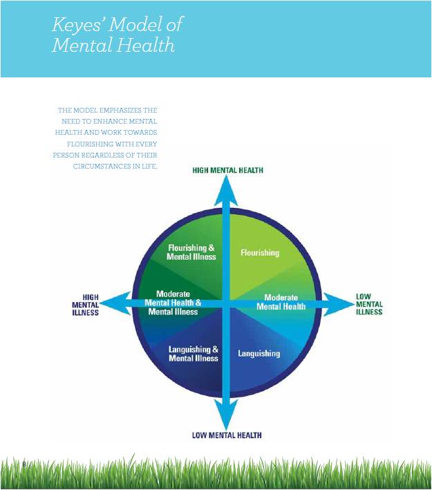 Keyes’ Model (2002) illustrates that mental health is a complex state and not merely the absence of mental illness symptoms or diagnosis. It is also the presence of something positive. The horizontal line measures mental illness. The vertical measures a person’s mental health as a separate but interrelated concept. In considering mental health and mental illness as separate but related - this model demonstrates how those with many attributes of mental health (emotional, psychological, and social well-being) can still have varying degrees of mental illness – and how even those with high levels of mental illness can have many attributes of mental health . A critical message of Keyes’ work is that maintenance and protection of positive mental health, and not just alleviation of mental distress, is necessary to achieve a mentally healthy population.