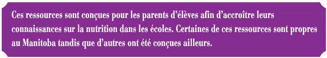 Entre la première année et la fin du secondaire, un élève peut manger plus de 2 400 repas à l’école! Créer des repas scolaires savoureux et nutritifs est un défi pour de nombreux parents. La bonne nouvelle, c’est qu’avec un peu de planification et quelques idées, vous pouvez préparer un déjeuner qui non seulement a bon goût, mais qui contient aussi un plus nutritionnel. www.gov.mb.ca/healthyschools/foodinschools/resources/lmc.html |