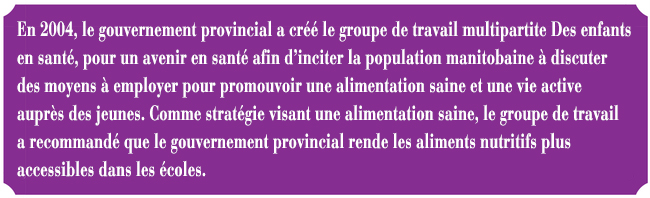 - d’exiger que toutes les écoles aient dans leur plan scolaire une politique officielle concernant l’alimentation et la nutrition à l’école, et qu’elles rendent compte chaque année aux conseils consultatifs de parents et à Éducation et Apprentissage de la petite enfance Manitoba des mesures prises concernant les politiques sur l’alimentation et la nutrition à l’école;