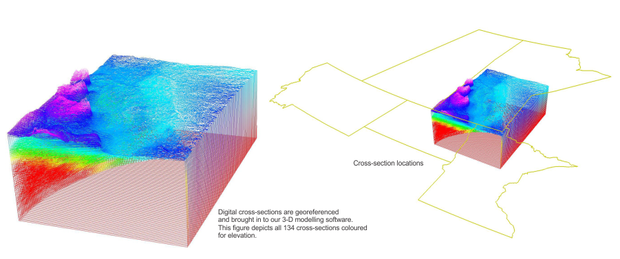 Key model inputs are: digital elevation data, bathymetric charts for large lakes, offshore seismic surveys, surficial geological maps, drillhole and seismic data, existing models for the Phanerozoic rock units (the Stratigraphic Map series), and drillhole data. For the Quaternary, critical inputs to the 3-D model are cored holes logged by geologists and geophysical surveys. These high-quality drillholes are extrapolated laterally using data from provincial drillhole databases that include data over 100,000 sites.