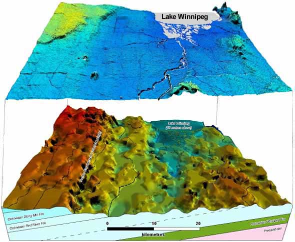 The lower Paleozoic Gunton Escarpment is visible on both the surface DEM and the bedrock DEM. The bedrock DEM was created using the waterwell record database.
