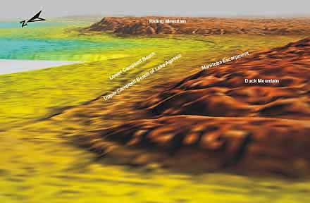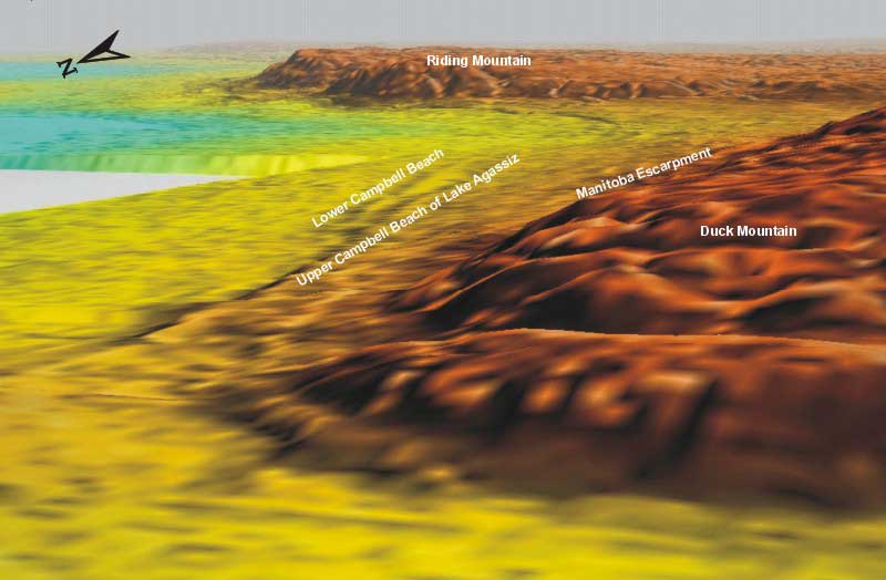 Along the Manitoba Escarpment, beaches from glacial Lake Agassiz are clearly evident. Generally composed of sand and gravel, these ridges are about 5 metres in height and were formed about 9500 years ago.