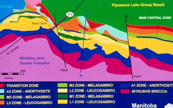 | Ilmenite and magnetite are found at Pipestone Lake, close to Cross Lake. Gossan Resources Limited (50%) and Cross Lake Mineral Exploration Inc. (50%) have outlined by drilling 243 million tonnes of mineralization containing 9.28% ilmenite, 23.6% magnetite and 0.28% vanadium pentoxide to a depth of 300 m, open at both ends. The mineralization is within the main central and disseminated zones of the 730 million tonne deposit, which averages 70.74 m (true width) and 6325 m in length. The companies have carried out the necessary mineralogical, milling and furnace work to prepare for the economic separation of the minerals from Pipestone Lake. Potential products would be titanium dioxide for paint and paper industries and magnetite and vanadium pentoxide for steel-making. Drilling by Gossan at Kiskitto Lake, 50 km to the southeast, penetrated a 100+ m wide zone of titanium-vanadium-iron mineralization. The zones, 2–4 km in length, carried 1-5% TiO2, with occasional 6–7 m wide intervals of 5–7% TiO2. Suggested References Assessment File 73001, Manitoba Economic Development, Investment, Trade and Natural Resources, Winnipeg Assessment File 73005, Manitoba Economic Development, Investment, Trade and Natural Resources, Winnipeg Assessment File 72915, Manitoba Economic Development, Investment, Trade and Natural Resources, Winnipeg Cameron, H.D.M. 1992: Pipestone Lake anorthosite complex: geology and studies of titanium-vanadium mineralization; Manitoba Energy and Mines, Geological Services, Open File Report OF92-1, 134 p. Dresler, W. 1995: A metallurgical evaluation of the extraction of titanium, vanadium and iron from main central zone of the Pipestone Lake ilmenite-magnetite deposit in Manitoba: final report; Energy, Mines and Resources Canada, 25 p. Jobin-Bevans, L.S., Peck, D.C., Cameron, H.D.M. and McDonald, J.P. 1995: Geology and oxide mineral occurrences of the central and eastern portions of the Pipestone Lake anorthosite complex (parts of NTS 63I/5 and I/12); in Report of Activities 1995, Manitoba Energy and Mines, Geological Services, p. 74–83. Jobin-Bevans, L.S. 1997: Geology, mineral chemistry and petrogenesis of the Pipestone Lake anorthosite complex; M.Sc. thesis, University of Manitoba, 400 p. scale 1:2000 3300. Peck, D.C., Cameron, H.D.M. and Corkery, M.T. 1994: Geological environments and characteristics of Ti-V-Fe oxide mineralization in the western part of the Pipestone Lake anorthosite complex; in Report of Activities 1994, Manitoba Energy and Mines, Geological Services, p. 118–129. |