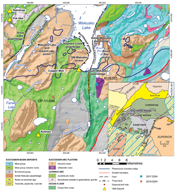 Determine the nature and timing of dolomite–phlogopite-bearing intrusions in the area directly south of Wekusko Lake.