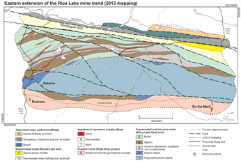 Anderson, S.D. 2013: Geology and structure of the eastern extension of the Rice Lake mine trend, Rice Lake greenstone belt, southeastern Manitoba; Manitoba Mineral Resources, Manitoba Geological Survey, Preliminary Map PMAP2013-6, scale 1:10 000.