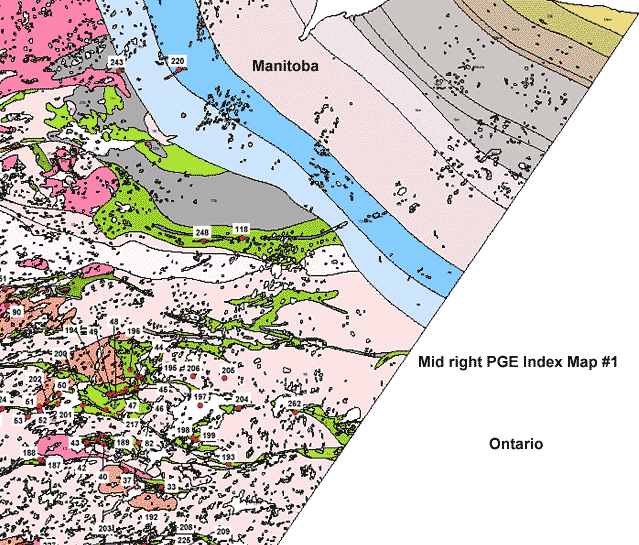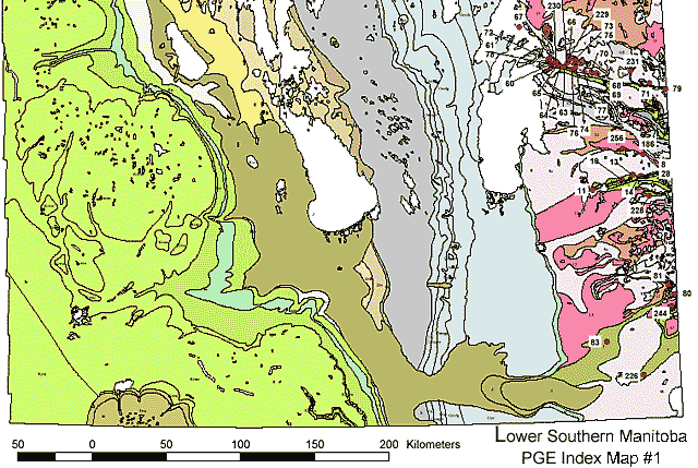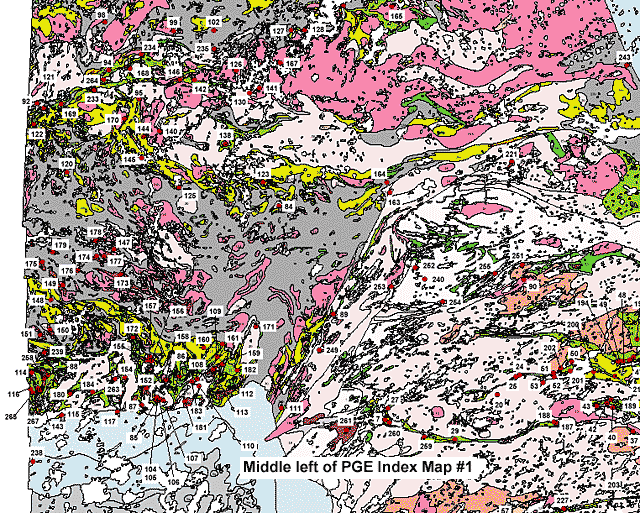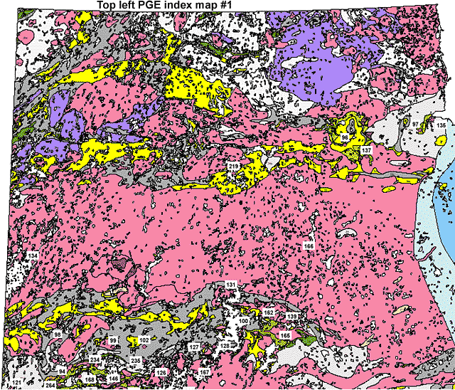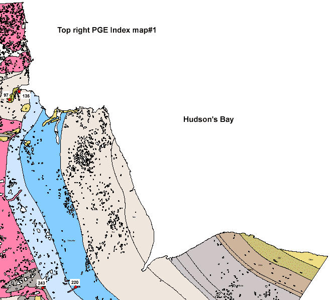 - We have also provided two non-linked index maps which can also be downloaded from the ftp site. Reminder: the single index maps are not linked to the main database. Map #1 is the main pge occurence map and is the first page of the report in of2000-5.pdf and Map #2 is a topographic map which shows the red occurrence dots, as well as the names of lakes, towns, cities, railways and roads.