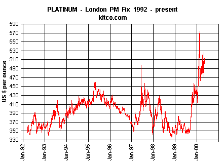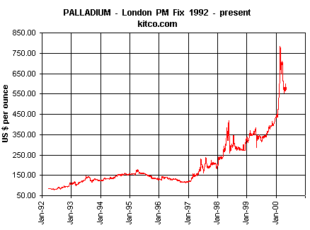 London Palladium Fix: 1992 - June, 2000. Displays the use in Palladium and Platinum rise due to increased fabrication, primarily in the automotive sector. (Graphs from www.kitco.com)