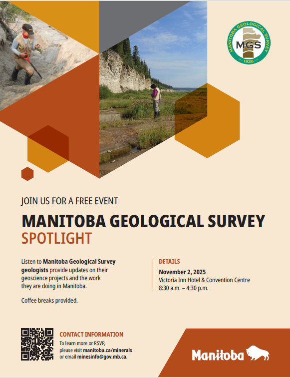 Thank you for attending the 2025 MGS Spotlight!The first annual MGS Spotlight took place on November 2, 2025, during which geologists provided updates on their current geoscience projects and highlighted the important work underway across Manitoba. We’re already looking forward to MGS Spotlight 2026! Check back here often for updates, announcements, and details about next year’s event. |