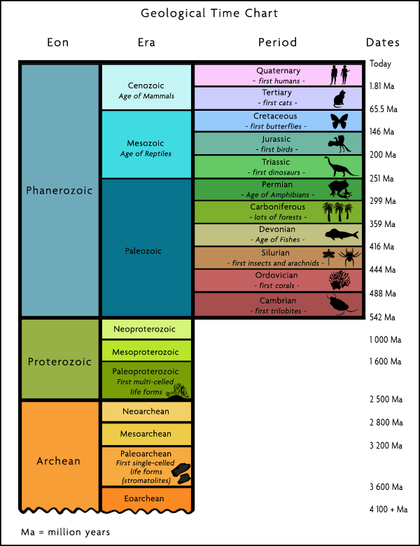 As a geo-detective, you would also explore time the way a geologist does --- not in seconds or minutes or hours, but in eons, eras and periods. Look at this geologic time chart below. Can you find the geologic period where humans showed up?