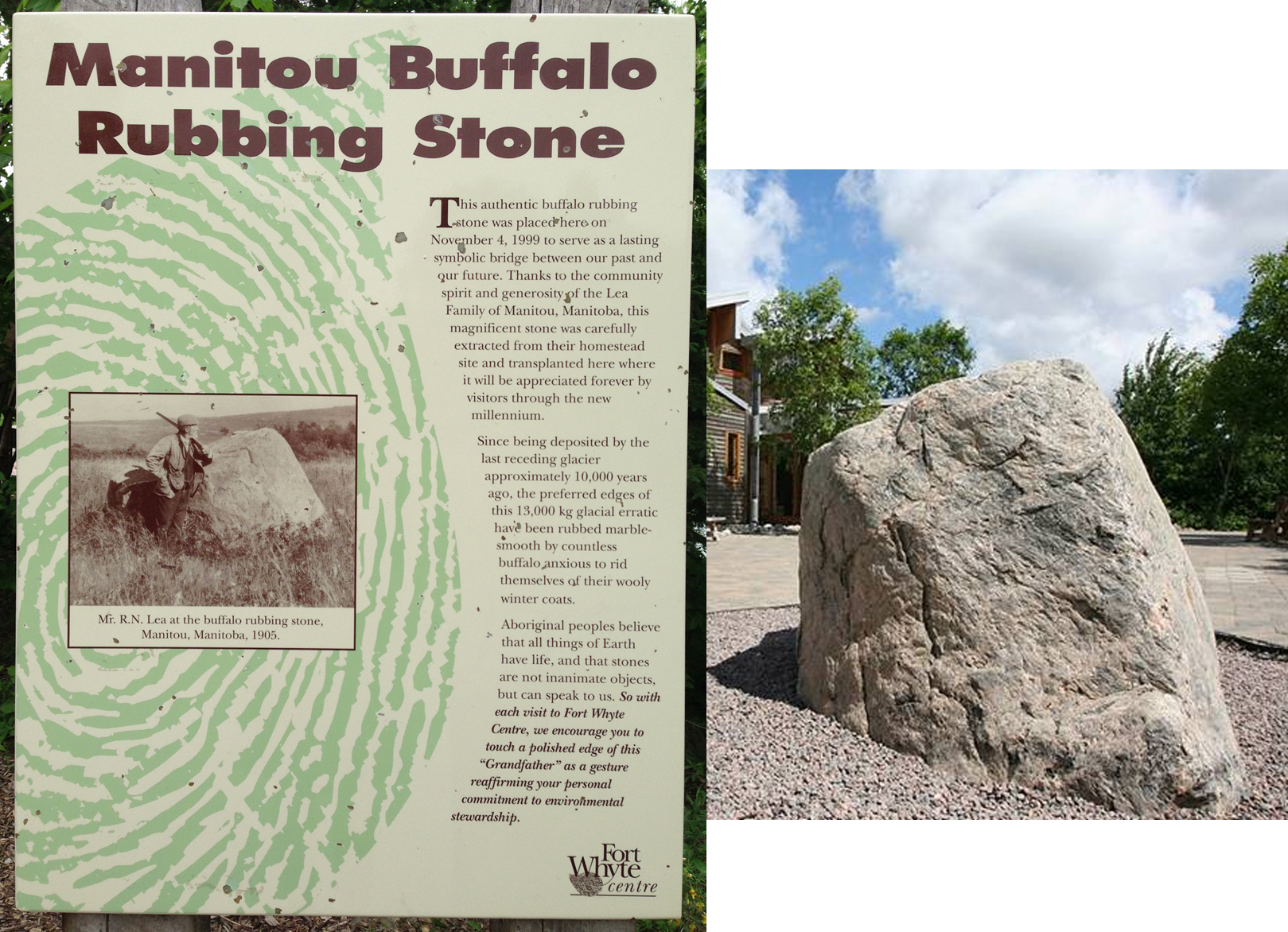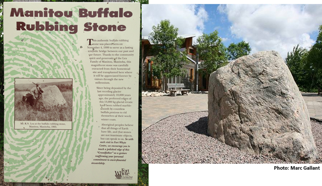Need to scratch your back? So did bison as they roamed the plains of south western Manitoba many years ago. Look closely around Winnipeg's Fort Whyte Nature Centre and their Buffalo Stone Café, and in fields and towns around Manitoba, and you just might come across giant rocks that were rubbing stones or backscratchers for bison! (click image below for larger view).